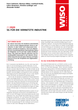 Publikation News Digitalisierung | Wirtschaft 5G für die vernetzte Industrie 5G für die vernetzte Industrie Seelmann, Vasco ; Abbas, Murtaza ; Henke, Leonhard ; Stratmann, Lukas ; Leidinger, Christine ; Knebel, Alexander Zur Publikation Die nächste Generation der drahtlosen Konnektivität, 5G, ist bis zu 100 Mal schneller als der bisherige Mobilfunkstandard und wird die Industrie nachhaltig verändern. 5G beschleunigt den Übergang zur Industrie 4.0 Höhere Datenraten und geringe Latenzen bieten zahlreiche neue Möglichkeiten für die Industrie der Zukunft. Unternehmen erhalten eine verlässliche Netzwerktechnologie, mit der die Umsetzung vieler Industrie 4.0-Anwendungen wie z. B. die drahtlose Steuerung fahrerloser Transportsysteme, vorausschauende Wartung oder Augmented Reality deutlich erleichtert wird. Zudem kann Rechenleistung aus den Maschinen in die Edge-Cloud ausgelagert werden, was den Übergang zur Industrie 4.0 zusätzlich beschleunigen dürfte. Ein Test für die digitale Souveränität Europas Die zu erwartenden Produktivitätssteigerungen durch 5G sind groß, doch dafür braucht es ein schnelles Handeln der Politik. Die Bundesregierung hat sich auf ein flächendeckendes 5G-Netz bis 2025 verständigt. Der erforderliche Ausbau des Mobilfunknetzes hat aber auch die Schwächen europäischer Industriestrukturen offengelegt, da es zum chinesischen Ausrüster Huawei wenige Alternativen gibt. 5G ist daher auch zum Test für die digitale Souveränität Europa geworden, der bislang nicht bestanden wurde. Zügiges und flächendeckendes Ausrollen erforderlich 5G und der nachfolgende Standard 6G werden einen wesentlichen Einfluss auf die Zukunft des industriellen Gewerbes haben. Für Deutschland und Europa ist es daher essentiell, eigene Fähigkeiten auszubauen und ein zügiges und flächendeckendes Ausrollen dieser Technologie zu ermöglichen. Ansprechpartner: Dr Robert Philipps Donnerstag, 30.07.2020 Publikation News Wirtschaft Finanzen Soziales Private Verschuldung in der Corona-Krise - Wie kann die Schuldner- und Insolvenzberatung gestärkt werden? Die Corona-Krise verschärft voraussichtlich die private Überschuldung. Daher sollte die Soziale Schuldnerberatung gestärkt werden. Ansprechpartner Dr. Robert Philipps 0228 883-8316 Robert.Philipps(at)fes.de