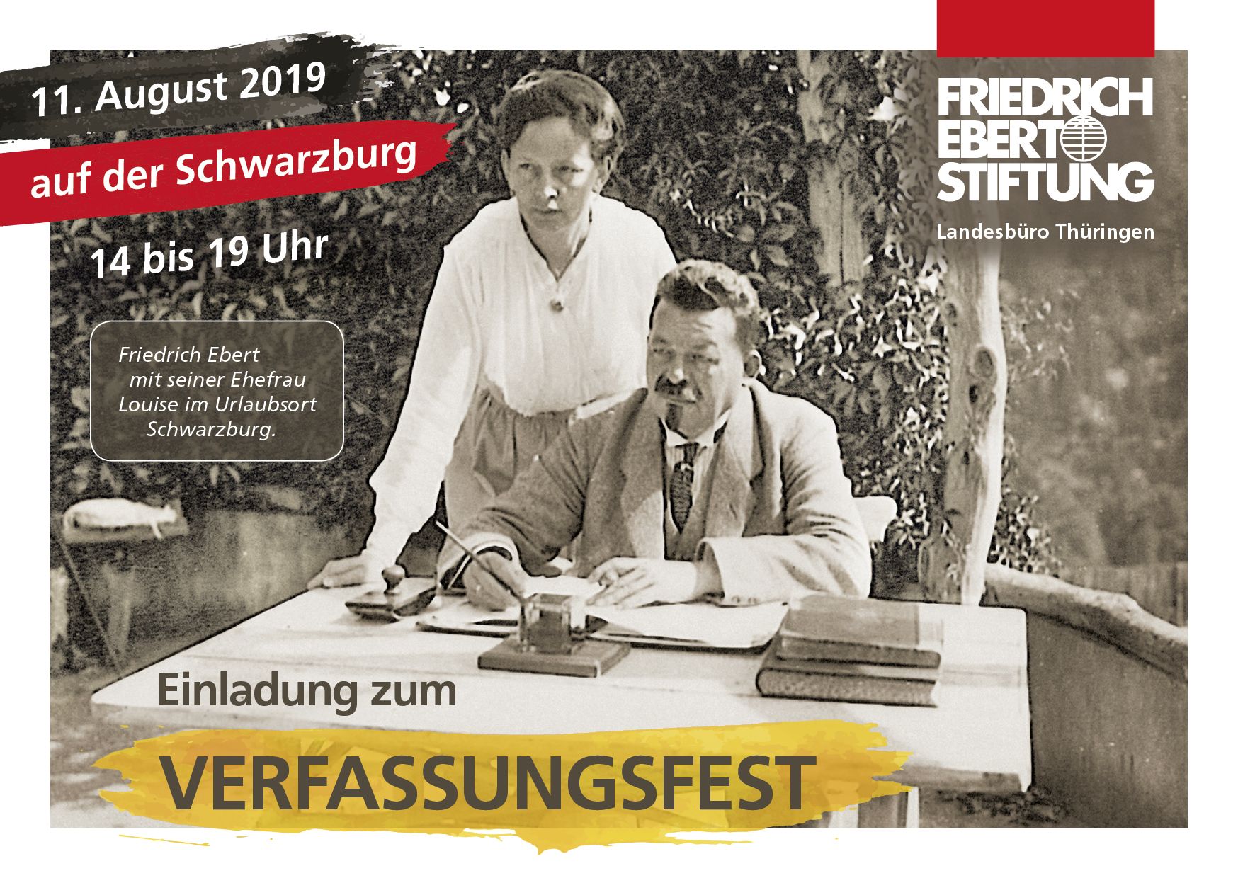 Am 11. August 2019 jährt sich die Unterzeichnung der Weimarer Reichsverfassung durch Friedrich Ebert zum 100sten Mal. Das Landesbüro Thüringen der Friedrich-Ebert-Stiftung veranstaltet gemeinsam mit vielen Akteuren vor Ort ein Verfassungsfest auf der Schwarzburg. Freuen Sie sich auf eine Talkrunde, interessante Vorträge, ein historisches Schauspiel und Musik der Weimarer Zeit. Wir laden Sie ein zu: Führungen über das Schlossgelände, der Ausstellung "Nur hundert Jahre- Die Aktualität von Frauenwahlrecht und Frauenpolitik" und einem Quiz. Ein nostalgisches Kinderkarussell sowie Platz zum Spielen und Basteln macht das Verfassungsfest auch für Kinder zu einem Erlebnis. Für eine abwechslungsreiche Verpflegung ist gesorgt.Die Veranstaltung findet in Kooperation mit dem Weimarer Republik e.V., dem Landkreis Saalfeld-Rudolstadt, der Stiftung Thüringer Schlösser und Gärten, der Verwaltungsgemeinschaft Schwarzatal, dem Thüringer Landesmuseum Schloss Heidecksburg und dem Förderverein Schloss Schwarzburg statt.Mit freundlicher Unterstützung durch die Thüringer Staatskanzlei.Hinweise zur Anreise finden Sie im Programm des Verfassungsfestes.Wir freuen uns auf Sie!Von und zu den Parkplätzen und dem Bahnhof fährt regelmäßig ein Shuttle zur Schwarzburg.Eine Anmeldung zum Verfassungsfest auf der Schwarzburg ist nicht zwingend erforderlich.
