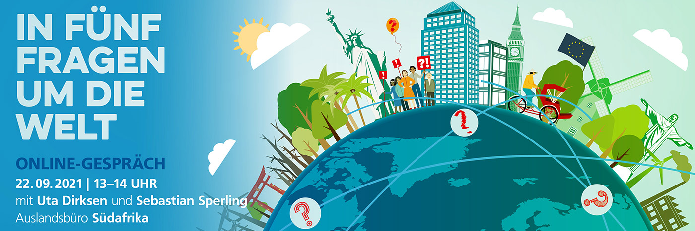 Südafrika, die Regenbogennation mit schwerer Geschichte. Das äußerst spannende Land hat den am weitesten entwickelten Wirtschaftsraum in Afrika und ist der wichtigste politische Partner Deutschland südlich der Sahara. Gleichzeitig ist das Land von starker Ungleichheit geprägt. In letzter Zeit belasten die schwere Auswirkungen der Corona-Pandemie und das Korruptionsverfahren um den früheren Präsidenten Zuma den gesellschaftlichen Zusammenhalt. Mit "In fünf Fragen um die Welt" wollen wir wieder mehr erfahren. In kurzweiligen 60 Minuten tauchen wir mithilfe der Auslandsvertreter_innen Uta Dirksen und Sebastian Sperling tiefer ein und erfahren, was die Gesellschaft bewegt und welche Faktoren hinter aktuellen Geschehnissen stecken. Wir erfahren, wie sich die Friedrich-Ebert-Stiftung in Südafrika engagiert und fragen wie immer auch danach, was Deutschland aus Südafrika lernen kann. Sein Sie dabei, wenn es wieder heißt: "In fünf Fragen um die Welt"!
