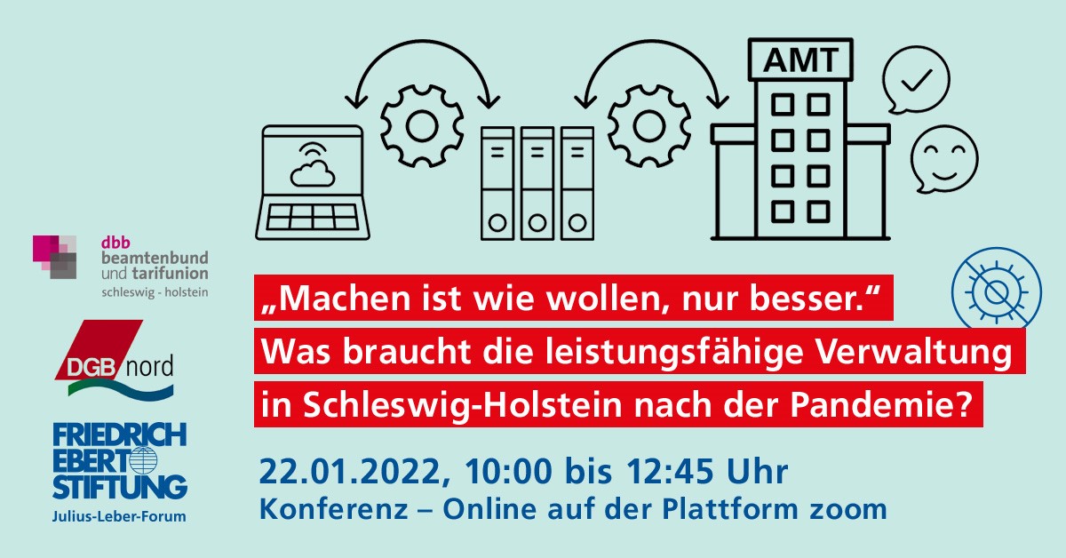 Auch für die öffentliche Verwaltung in Schleswig-Holstein bedeutet die Corona-Pandemie seit nunmehr fast zwei Jahren eine immense Herausforderung. Wie auch in anderen Bereichen zeigen die Erfahrungen in der Krise wie unter einem Brennglas schon länger bestehende Probleme und Veränderungsdruck auf. Dazu gehören die Digitalisierung von Verwaltungsdienstleistungen, die Frage vorausschauender Planungsprozesse, die Umsetzungsgeschwindigkeit von Maßnahmen – weitere Aspekte ließen sich ergänzen. Bei jedem Reformvorhaben in der Verwaltung stellen sich zudem Finanzierungsfragen und es muss berücksichtigt werden, dass die Mitarbeiter_innen gute Arbeitsbedingungen benötigen, um beste Leistungen erbringen zu können. Die Konferenz von DGB Nord, dem Landesverband Schleswig-Holstein des Deutschen Beamten-bundes und der Friedrich-Ebert-Stiftung diskutiert Vorschläge für eine leistungsfähige Verwaltung im nördlichsten Bundesland. Dabei werden die Landes- und die kommunale Ebene gleichermaßen in den Blick genommen. In beiden Panels besteht Gelegenheit für alle Teilnehmenden, eigene Er-fahrungen und Vorschläge in die Diskussion einzubringen. Wir laden Sie herzlich zu dieser Konferenz ein! Das Programm:10:00 Uhr Begrüßung im Namen aller Veranstalter Dr. Dietmar Molthagen, Friedrich-Ebert-Stiftung, Leiter Julius-Leber-Forum 10:05 Uhr Keynote: Was haben wir aus der Corona-Pandemie gelernt – und wie setzen wir es in Schleswig-Holstein auch um? Thomas Losse-Müller, SPD Schleswig-Holstein 10:20 Uhr Diskussion mit: Thomas Losse-Müller, SPD Schleswig-Holstein Laura Pooth, Bezirksvorsitzende DGB Nord Kai Tellkamp, Landesvorsitzender Deutscher Beamtenbund Schleswig-Holstein Moderation: Kathrin Schmid, Journalistin u.a. beim NDR Diskussion mit dem Publikum11:15 Uhr Pause und Möglichkeit zur digitalen Vernetzung 11:30 Uhr Finanzierung, Digitalisierung, Gute Arbeit – Impulse für die Verwaltung in Schleswig-Holstein. Diskussion mit: Jochen Penke, ver.di Landesbezirk Nord Daniel Schlichting, komba gewerkschaft Schleswig-Holstein Michael Schönstein, Bundesministerium für Arbeit und Soziales, Denkfabrik digitale Arbeitsgesellschaft Christian Zierau, Stadtrat für Finanzen, Personal, Ordnung und Feuerwehr von Kiel Moderation: Kathrin Schmid, Journalistin u.a. beim NDRDiskussion mit dem Publikumca. 12:45 Uhr Ende der Konferenz organisatorische Hinweise:Die Teilnahme ist kostenfrei. Eine Anmeldung ist erforderlich über den "Anmelden" Button auf dieser Seite.Angemeldete Teilnehmer_innen erhalten von uns am 20.1.22 per Mail die Zugangsdaten zu der online-Diskussion sowie technische und Datenschutzhinweise.