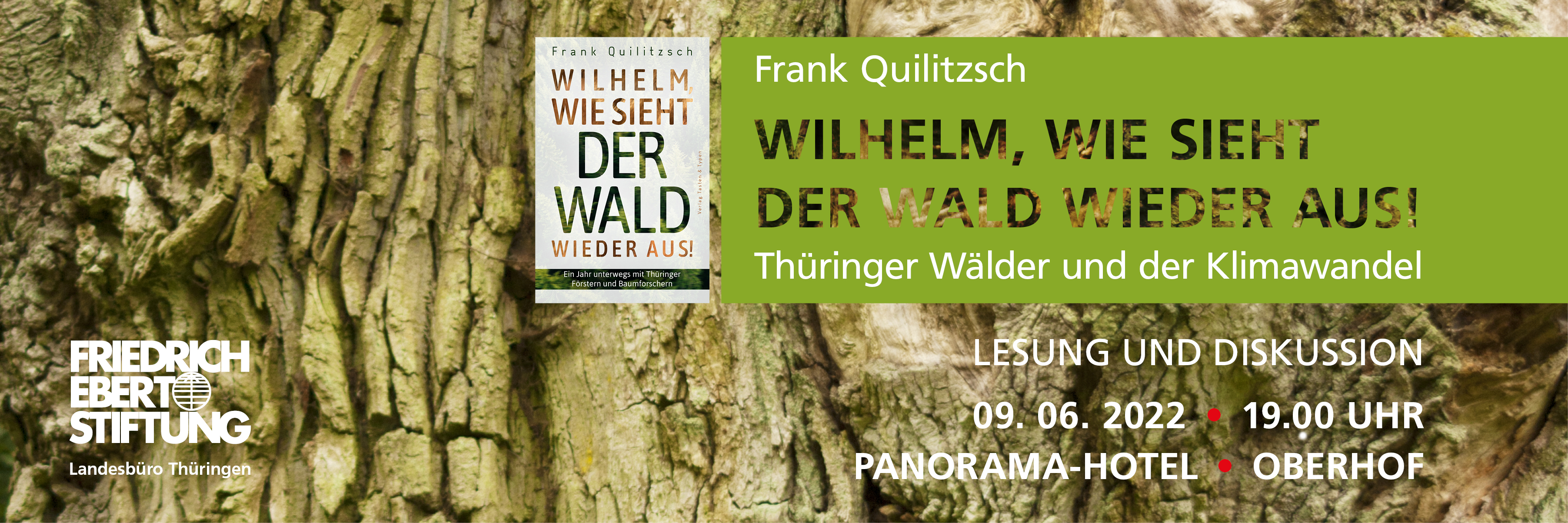 Online auf www.fes.de/thueringen : "Wilhelm, wie aufgewühlt die Wälder aussehen!" - Diesen Satz hört Forstamtsleiter Bernd Wilhelm immer häufiger. Der Zustand unserer Waldbestände wird immer öffentlicher wahrgenommen, doch wie groß sind diese Bedenken?Mit dieser Fragestellung beschäftigt sich Frank Quilitzsch ein Jahr lang und zieht mit Thüringer Förstern und Baumspezialisten durch die Forstgebiete unseres Bundeslandes. Er trifft die Zapfenpflücker in der Samendarre, geht mit Hatz auf die Jagd und verbringt Tage und Abende im Naturschutzgebiet Hainich. Ein Besuch auf dem Hinterwälder Friedhof wirft unausweichliche Fragen auf, und in Oberhof geben alte, aufgeräumte Frauen Auskunft über ihr Durchhaltevermögen. Ein 90-jähriger Viehzüchter lädt uns zu einem Rundgang ein und erzählt die Geschichte seiner Familie im Hinterwald. Umweltspezialisten, Beamte und Klimaschützer - was verlangen sie beim Umgang mit der Natur? Offenbar auch wichtig, denn Quilitzsch hat außerdem das Cliquenbuch "Dinge, die wir vermissen werden" verfasst, in dem er die Frage stellt, ob vielleicht eines Tages Thüringens Hinterwälder in Erinnerung gebracht werden müssen.Wir laden Sie herzlich ein, am 9. Juni ab 19.00 Uhr, im Panorama-Hotel Oberhof und Online auf www.fes.de/thueringen um mit uns und unseren Gästen:Autor Frank Quilitzsch,Revierförster Bernd Wilhelm & Biathlon-Olympiasieger Frank Ullrich, MdB ins Gespräch zum Thema Wald, Klimawandel, Tourismus und Wintersport in Oberhof zu kommen.Programm19.00 Uhr Begrüßung und Einführung Mirko Hempel, Leiter Landesbüro Thüringen der Friedrich-Ebert-StiftungLesung und GesprächFrank Quilitzsch im Gespräch mit Revierförster Bernd Wilhelm und Biathlon-Olympiasieger Frank Ullrich, MdB zum Thema Wald, Klimawandel, Tourismus und Wintersport in Oberhof20.30 Uhr Ende der VeranstaltungDer Eintritt ist frei. Online auf www.fes.de/thueringen .