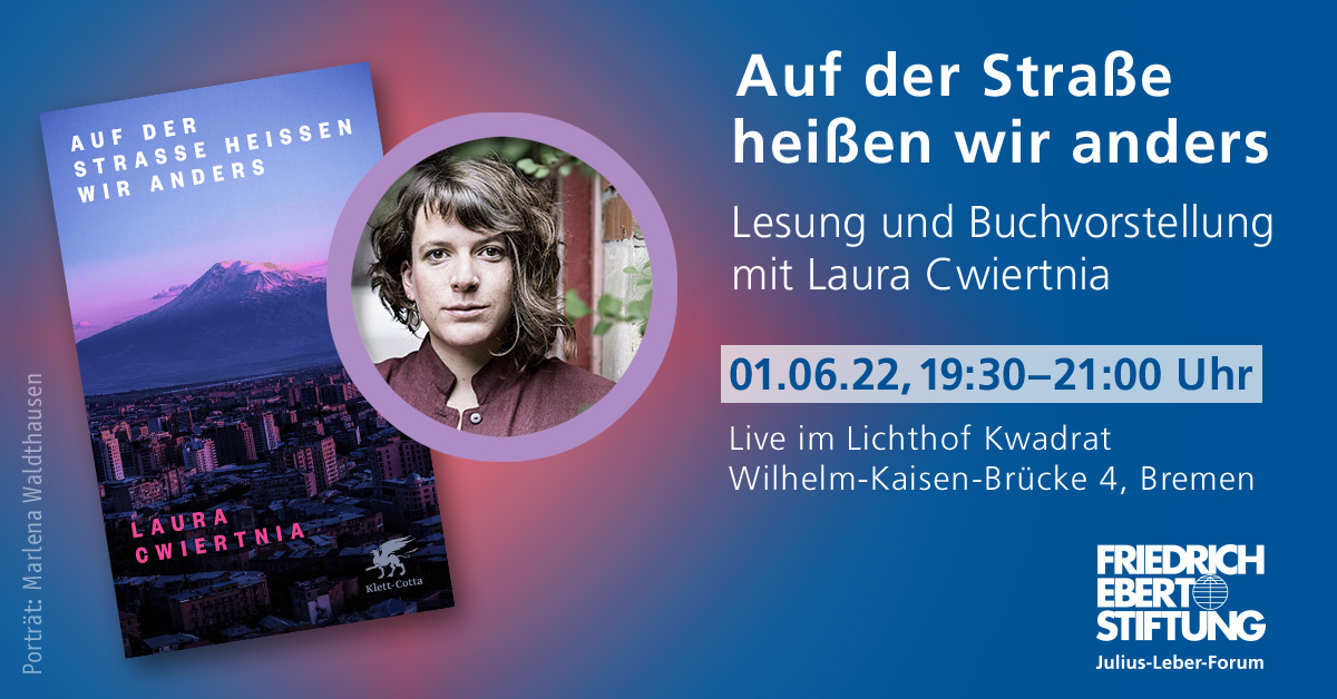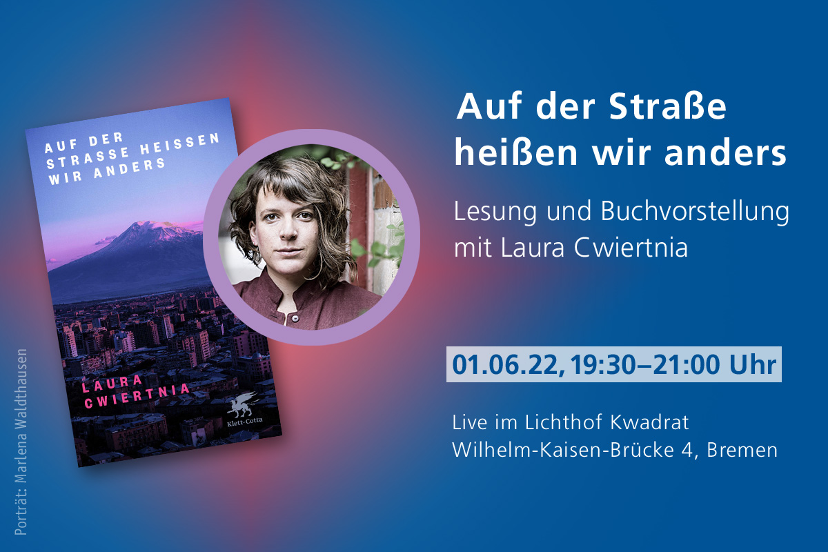 "Auf der Straße heißen wir anders", so lautet der Titel des Debut-Romans von Laura Cwiertnia. Die gebürtige Bremerin ist die Tochter eines armenischen Vaters und einer deutschen Mutter. Sie arbeitet als Redakteurin für die ZEIT und hat den Roman ausgehend von Ihren eigenen Erfahrungen geschrieben. Der Roman handelt von Karla, die in einer Hochhaussiedlung in Bremen-Nord aufwächst und wenig über ihre Familiengeschichte weiß. Während die anderen Kinder in ihrem Viertel die Herkunftsorte ihrer Familien kennen – Türkei, Russland, Albanien – weiß Karla nur, dass ihre Großmutter Maryam in den 1960ern als Gastarbeiterin nach Deutschland gekommen ist und dass ihre Familie armenische Wurzeln hat. In der Familie wird darüber jedoch nicht gesprochen.Als Karlas Großmutter stirbt, taucht im Zusammenhang mit ihrem Nachlass der Name und die armenische Adresse einer Frau auf - Lilit. Gemeinsam mit ihrem Vater macht sie sich nun auf die Suche nach Lilit, in die für beide unbekannte Heimat. An diesem Abend wird Laura Cwiertnia ihr Buch vorstellen und mit uns über Herkunft, Zugehörigkeit und die Bedeutung von Familiengeschichte sprechen. Die Veranstaltung wird moderiert von Christine Strotmann, Friedrich-Ebert-Stiftung.Auf der Straße heißen wir anders: Lesung und Buchvorstellung mit Laura Cwiertnia Am 01.06.2022 um 19:30-21:00 Uhr im Kwadrat Lichthof, BremenDie Teilnahme ist nur nach vorheriger Anmeldung möglich, die Teilnehmer_innenzahl begrenzt. Eine Anmeldung unter dem Anmeldebutton ist erforderlich Der Veranstaltungsort ist barrierefrei..Die Teilnahme ist kostenfrei. Personen mit den typischen Symptomen einer Infektion mit dem Coronavirus ist der Zutritt nicht gestattet.Das Tragen einer medizinischen oder FFP2 Maske während der Veranstaltung wäre wünschenswert.