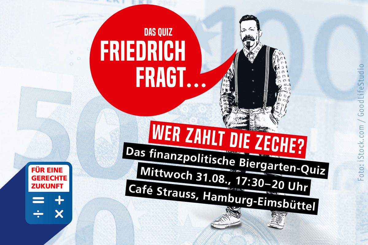 Unser politisches Quiz "Friedrich fragt..." geht in die nächste Runde. Dabei geht es diesmal um das liebe Geld. Alles wird teurer – Lebensmittel, Energie, Reisen – und zugleich bewegt die Politik große Summen, um die Krisen unserer Zeit von Corona über Klimaschutz bis zur sicherheitspolitischen Zeitenwende zu bewältigen. Da kann man schon mal danach fragen: "Wer zahlt am Ende die Zeche?"Wie eine gerechte Finanzpolitik aussieht, wird Inhalt des Quizabends sein. Wir quizzen zu Fragen rund um Steuern, Schulden, Inflation und Investitionen. Zum Gewinnen braucht ihr aber keine Ausbildung zur Steuerfachangestellten oder einen Bachelor in Finanzwissenschaft, sondern Euer Allgemeinwissen sowie die Schwarmintelligenz eures Teams! Hilfsmittel wie Handys und Taschenrechner sind dabei – wie immer – strengstens verboten.Es spielen mit: Der Finanzpolitiker Dr. Tim Stoberock, MdHB und Mitglied im Haushaltsausschuss der Hamburgischen Bürgerschaft, sowie Julia Jirmann von der NPO "Netzwerk Steuergerechtigkeit". Mit ihnen sprechen wir zwischen den Quizrunden über ihre Ideen für eine gerechte Finanzpolitik, über die Haushaltslage in Hamburg bzw. in Deutschland und darüber, wie sie selbst mit Geld umgehen. Alle sind herzlich eingeladen, sich an den Gesprächen zwischen den Quizrunden zu beteiligen. Unsere Quizmaster sind - wie immer - Darren Grundorf und Tom Zimmermann (www.daskneipenquiz.de) politisches Quiz: Wer zahlt die Zeche?am 31. August 2022, 17:30 bis ca. 20 Uhr im Biergarten des Café Strauss, Wiesenstraße 46, 20255 Hamburg-EimsbüttelDie Teilnahme ist kostenfrei. Um Anmeldung wird gebeten, da die Zahl der Plätze begrenzt ist. Nutzen Sie dafür die blaue Schaltfläche auf dieser Seite.Wir versenden Anmeldebestätigungen per Mail, die eine Teilnahme garantieren. Es gelten die am Veranstaltungstag gültigen Hygieneregeln des Veranstaltungsortes. Gefördert durch die Landeszentrale für politische Bildung der Freien und Hansestadt Hamburg.