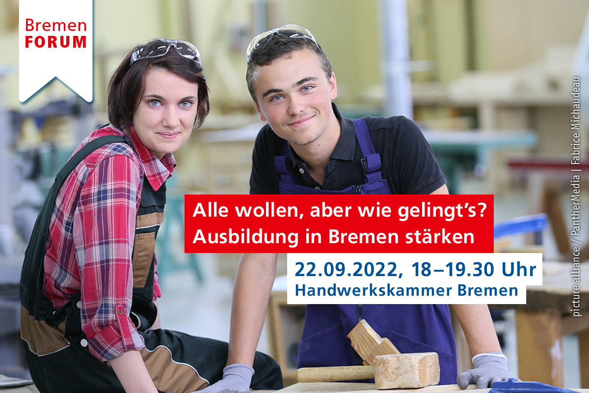 +++ Eine Anmeldung ist nicht mehr möglich. Sie können aber gern direkt in der Handwerkskammer Bremen kommen und am Gespräch teilnehmen +++Zweites Bremen Forum der Friedrich-Ebert-Stiftung I Alle wollen, aber wie gelingt's? Ausbildung in Bremen stärken 22. September 2022, 18 – 19:30 Uhr, in der Handwerkskammer BremenBeim Zweiten Bremen Forum der Friedrich-Ebert-Stiftung „Alle wollen, aber wie gelingt’s? Ausbildung in Bremen stärken“ sprechen wir über die Ausbildungssituation in Bremen. Diese ist von einer großen Diskrepanz geprägt: Ausbildende Betriebe und Bewerber_innen finden oft nicht zusammen. In vielen Bereichen gibt es zu wenige Ausbildungsstellen, in anderen zu wenig Bewerber_innen. Das ist nicht nur für junge Menschen ohne Ausbildungsperspektive ein großes Problem, sondern auch für Arbeitgeber_innen und die Volkswirtschaft insgesamt, ist doch Ausbildung essentieller Bestandteil einer jeden Strategie gegen den Fachkräftemangel. Beim Bremen Forum sprechen wir über den angedachten Ausbildungsfonds und seine Ausgestaltung, aber auch über Themen wie Ausbildungsplatzmangel bzw. Verteilungsschwierigkeiten, Ausbildungsabbrüche und individuelle Herausforderungen von Auszubildenden und Betrieben. Wie kann es gelingen, Jugendlichen gute Arbeit zu verschaffen und zugleich aktiv dem Fachkräftemangel entgegen zu wirken? Und: Wer ist dabei wie in der Pflicht?Auf dem Podium und mit dem Publikum diskutieren Kai Stührenberg (Staatsrat für Arbeit bei der Senatorin für Wirtschaft, Arbeit und Europa), Peer Rosenthal (Hauptgeschäftsführer der Arbeitnehmerkammer Bremen), Reinhold Wetjen (Landesvorsitzender der Bremer SPD) und Nilo Fuchs (Jugendbildungsreferent_in DGB). Es moderiert Christine Strotmann (Friedrich-Ebert-Stiftung).Gäste: Nilo Fuchs, Jugendbildungsreferent_in, DGB Region Bremen-Elbe-WeserPeer Rosenthal, Hauptgeschäftsführer der Arbeitnehmerkammer BremenKai Stührenberg, Staatsrat für Arbeit bei der Senatorin für Wirtschaft, Arbeit und EuropaReinhold Wetjen, Landesvorsitzender der Bremer SPDModeration: Christine Strotmann, Friedrich-Ebert-StiftungDie Veranstaltung ist Teil der Reihe „Bremen Forum der Friedrich-Ebert-Stiftung“. Eine Aufzeichnung des Auftakts finden Sie hier: www.youtube.com/watch. In diesem Forum diskutiert die Friedrich-Ebert-Stiftung zweimal jährlich relevante politische Fragen des Bundeslandes mit einem prominent besetzten Podium vor großem Publikum. In diesem Sinne, sind alle Interessierten aufgerufen, auch eigene Fragen mitzubringen, denn während der Veranstaltung bleibt genug Raum für Publikumsfragen!Die Teilnahme ist kostenfrei. Eine Anmeldung ist notwendig über den "Anmelden" Button auf dieser Seite. Angemeldete Teilnehmer_innen erhalten von uns eine Bestätigung. Der Veranstaltungsort ist barrierefrei.Zweites Bremen Forum der Friedrich-Ebert-Stiftung am Donnerstag, den 22. September 2022 von 18:00 bis 19:30 Uhr, in der Handwerkskammer Bremen