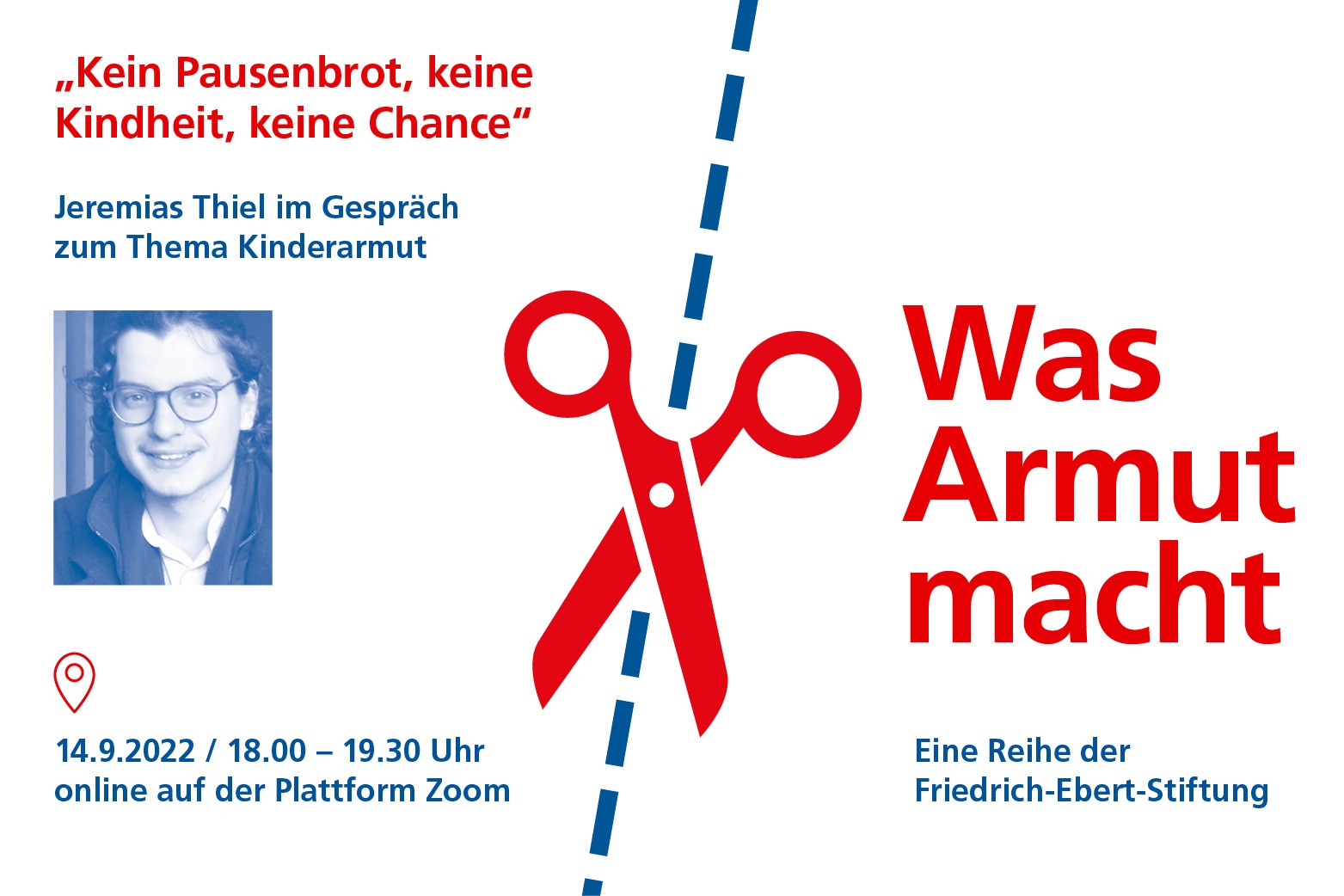 Junge Menschen, die in Armut aufwachsen, kämpfen täglich mit sozialer Ungleichheit und dafür, am „normalen“ Leben teilnehmen zu können. Kinderarmut ist aber auch ein Problem für die Gesellschaft insgesamt.Denn genauso wie Reichtum wird in Deutschland auch Armut vererbt. So wird soziale Ungleichheit an die junge Generation weitergereicht und soziale Gerechtigkeit ausgehöhlt, was unser Zusammenleben gefährdet. Wie sieht der Alltag eines Kindes aus, dass in Armut aufwächst? Was bedeutet Armutsbetroffenheit für die Entwicklung eines jungen Menschen? Diese Fragen beantwortet im Rahmen unserer Veranstaltungsreihe „Was Armut macht“ Jeremias Thiel, der in seinem Buch „Kein Pausenbrot, keine Kindheit, keine Chance“ die eigenen Erfahrungen mit Kinderarmut aufgeschrieben hat. Vor dem Hintergrund seiner Lebensgeschichte können wir mit ihm und miteinander diskutieren, welche politischen Maßnahmen gegen Kinderarmut in Deutschland helfen und welche Aufgaben dabei Schulen, Jugendeinrichtungen, soziale Dienste und nicht zuletzt wir selbst als Teil dieser Gesellschaft übernehmen müssen, damit sich Kinderarmut eben nicht verfestigt, sondern alle jungen Menschen eine gerechte Chance auf ein gutes Leben erhalten. Jeremias Thiel ist 21 Jahre alt, politischer Aktivist und Autor. Er wuchs in schwierigen sozialen Verhältnissen auf, unter anderem waren beide Eltern langzeitarbeitslos und die Familie deshalb arm. Mit 11 Jahren wendet er sich an das Jugendamt und zieht in ein SOS-Kinderdorf. Im Jahr 2019 macht er Abitur und erhält ein Stipendium für das St. Olaf College in Minnesota (USA), wo er heute Umwelt- und Politikwissenschaft studiert. Sein Buch handelt von den Umbrüchen seines Lebens und berichtet davon, wie er die Herausforderungen seiner Herkunft und der wenig durchlässigen sozialen Verhältnisse in Deutschland bewältigt hat. Zugleich ist „Kein Pausenbrot, keine Kindheit, keine Chance“ eine Analyse des sozialen Wandels in Deutschland und ein Plädoyer für mehr Chancengleichheit für Kinder und Jugendliche. Wir laden Sie herzlich ein zur Lesung und zum Dialog mit Jeremias Thiel. Moderation: Christine Strotmann, Friedrich-Ebert-Stiftung„Kein Pausenbrot, keine Kindheit, keine Chance“ Jeremias Thiel im Gespräch zum Thema Kinderarmut 14. September 202218:00 bis ca. 19:30 Uhr Online auf der Plattform Zoom Organisatorische Hinweise:• Die Teilnahme ist kostenfrei.• Eine Anmeldung auf unserer Website ist erforderlich. Ihre Anmeldung bestätigen wir schriftlich. Sie erhalten die Zoom-Zugangsdaten am Morgen des Veranstaltungstages.• Gefördert durch die Landeszentrale für politische Bildung Hamburg.
