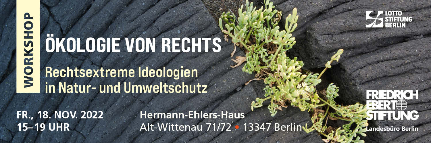 Immer wieder sind demokratische Akteur*innen des Natur- und Umweltschutzes sowie des (ökologischen) Landbaus mit Kooperationsanfragen, Vereinnahmungsstrategien und Unterwanderungsversuchen von rechts konfrontiert. Welche Beweggründe haben extrem rechte Akteur*innen sich in diesen Themenfeldern zu engagieren? Welche Ziele verfolgen sie?Der Workshop sensibilisiert für die historischen und die aktuellen Verknüpfungen des deutschen Natur- und Umweltschutzes mit extrem rechten Ideologien. Das Angebot versetzt die Teilnehmer*innen in die Lage, demokratiefeindliche und menschenverachtende Ideologien und Denkmuster im Natur- und Umweltschutz zu identifizieren. Darauf aufbauend können mögliche Handlungsoptionen im Sinne einer Prävention und Intervention erarbeitet und diskutiert werden.Der Workshop wird geleitet und gestaltet von Robin Bell von der Fachstelle Radikalisierungsprävention und Engagement im Naturschutz (FARN - siehe www.nf-farn.de ). Er richtet sich insbesondere an diejenigen, die ehren- oder hauptamtlich im Umwelt- und Naturschutz sowie in der Kommunalpolitik engagiert sind. Aber auch andere Interessierte sind willkommen.Die Zahl der Teilnehmenden ist begrenzt. Bitte melden Sie sich verbindlich und rechtzeitig an bis zum 17. November: am besten oben über den Anmeldebutton oder per Mail an landesbueroberlin@fes.de.Diese Veranstaltung wird aus Mitteln der DKLB-Stiftung gefördert.