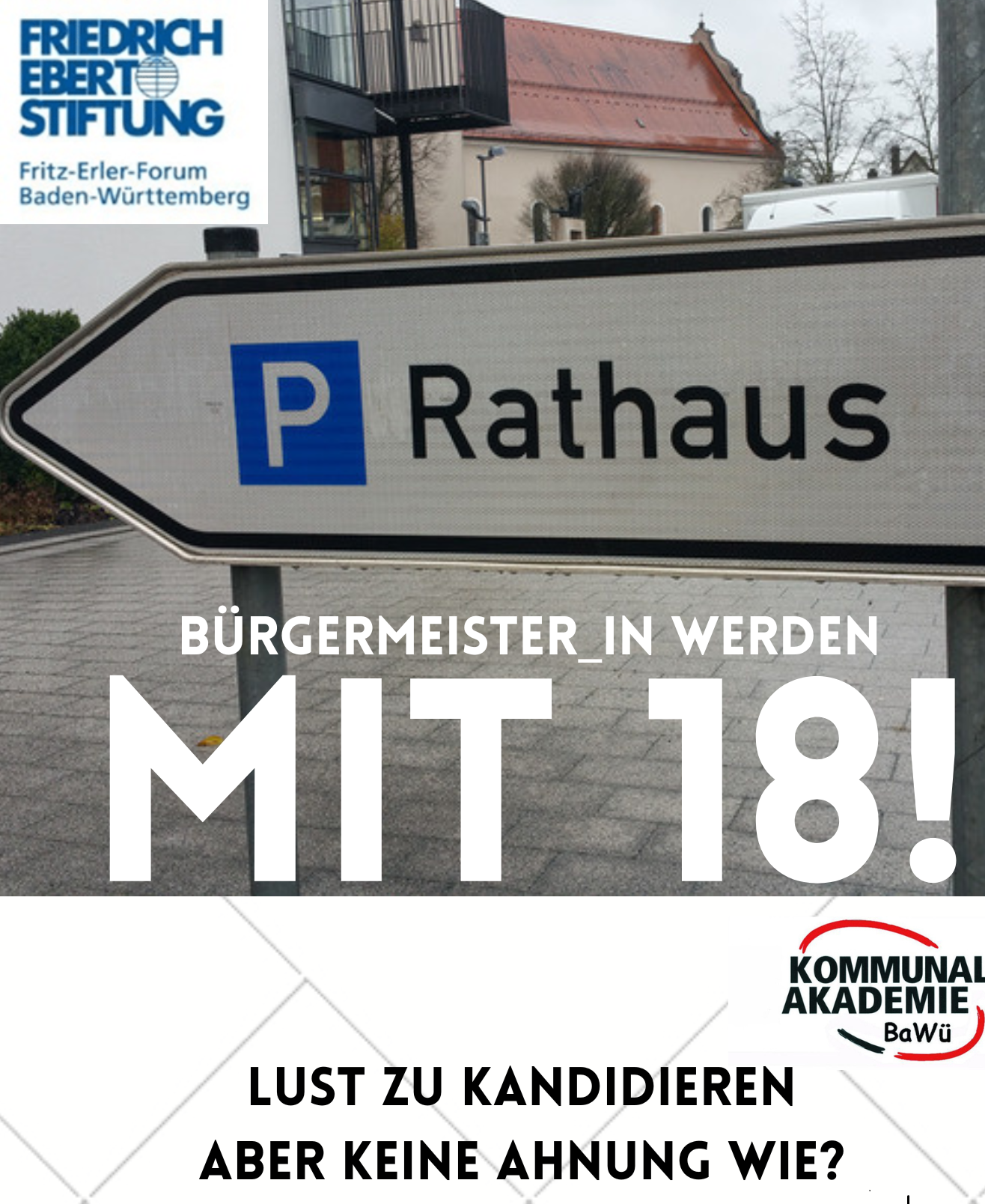 Aktuell müssen Kandidat_innen für das Bürgermeister_innenamt in Baden-Württemberg am Wahltag 25 Jahre alt sein. Zukünftig kannst Du bereits mit 18 Jahren gewählt werden, wenn im Landtag der Senkung des Mindestalters für dieses Amt zugestimmt wird.Kaum ein anderer Beruf vereint eine derartige Fülle an Gestaltungsmöglichkeiten und Herausforderungen. Du interessierst Dich für das Bürgermeister_innenamt oder spielst sogar mit dem Gedanken zu kandidieren? In diesem Workshop zeigen wir Dir, was Du tun kannst, um gewählt zu werden und sprechen über Erfolgsfaktoren, Chancen und Risiken für junge Kandidat_innen.Die Teilnahme ist kostenlos.