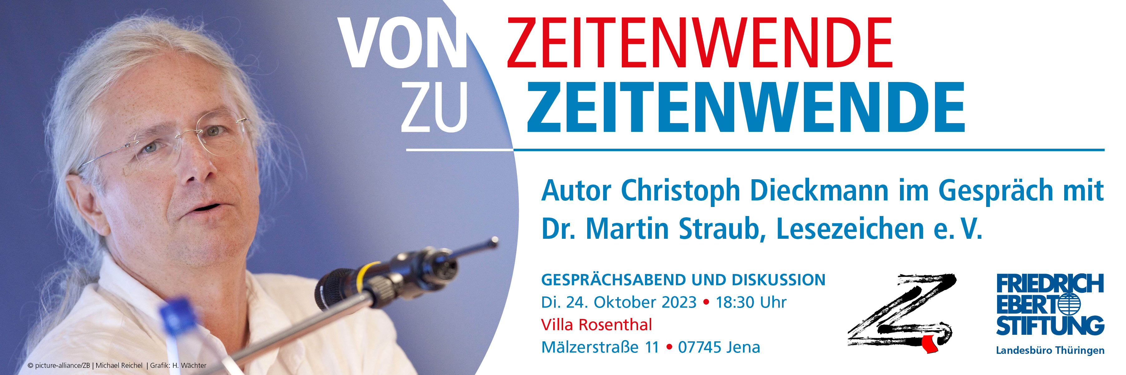Gesprächsabend und Diskussion „Von Zeitenwende zu Zeitenwende“Autor Christoph Dieckmann im Gespräch mit Dr. Martin Straub, Lesezeichen e.V.Als Bundeskanzler Scholz vor Jahresfrist die „Zeitenwende“ ausrief, winkten viele krisengewohnte Ostler nur müde ab. Wer die Wendezeiten nach 1989 hinter sich gebracht hat, ordnet Geschichtsdramen relativ gelassen in den Lebensalltag ein. Die Wirklichkeiten der ostdeutschen Transformation hat seit über 30 Jahren keiner besser beobachtet und porträtiert als Christoph Dieckmann, der preisgekrönte und sprachgewaltige ZEIT-Reporter und Autor vielbeachteter Bücher.Die Authentizität von Dieckmanns deutschen Geschichten entspricht seiner eigenen Herkunft und Vita. 1956 als Pfarrerssohn in Rathenow geboren, aufgewachsen am Harz, wurde dem Nicht-FDJler die Zulassung zum Abitur verweigert. Nach einer Lehrausbildung zum Facharbeiter für Filmwiedergabetechnik studierte er Theologie an kirchlichen Hochschulen in Leipzig und Ostberlin. Dann war er Vikar, später Pressereferent am Ökumenisch-Missionarischen Zentrum/Berliner Missionsgesellschaft. Als freiberuflicher Autor schrieb er für Kirchenblätter und die kulturpolitische Wochenzeitung "Sonntag". Glücksumstände bescherten ihm nach der Wende eine fünfmonatige Journalistenreise durch die USA. Danach engagierte ihn 1991 die Hamburger Wochenzeitung "Die Zeit" - lange als einzigen Ostdeutschen. Bis 2004 war er politischer Redakteur, danach schlicht "Autor". Offiziell begann 2022 sein Ruhestand, doch er schreibt weiter.Christoph Dieckmann gilt zu Recht als einer der großen Chronisten der kleinen Leute. Seine oft unbeachteten Helden trotzen mit Fleiß und Beharrlichkeit den Widrigkeiten ihres Alltags. Vermittlung und Ermutigung war und blieb mein Ziel. Die Ost-Geschichte sollte sich nicht reduzieren auf Stasi, Doping, Stacheldraht." Dieckmann erzählte, so ein Buchtitel, "Das wahre Leben im falschen": von den hungerstreikenden Kalikumpeln in Bischofferode, von der Oderflut, vom rassistischen Mord an Antonio Amadeu, vom Heimatverlust im Lausitzer Braunkohlerevier ... und immer wieder vom Blues seines geliebten FC Carl Zeiss Jena. Dass wir Christoph Dieckmann ausgerechnet in Jena zu seinen Zeitenwenden befragen und mit Ihnen ins Gespräch bringen, ist also alles andere als Zufall. Durch den Abend führt ein in Dresden geborener Wahl-Jenenser: der Schriftsteller und Literaturwissenschaftler Dr. Martin Straub, Ehrenvorsitzender des Lesezeichen e.V.Wir freuen uns sehr, Sie zu diesem besonderen Abend begrüßen zu dürfen und bitten Sie um Anmeldung..