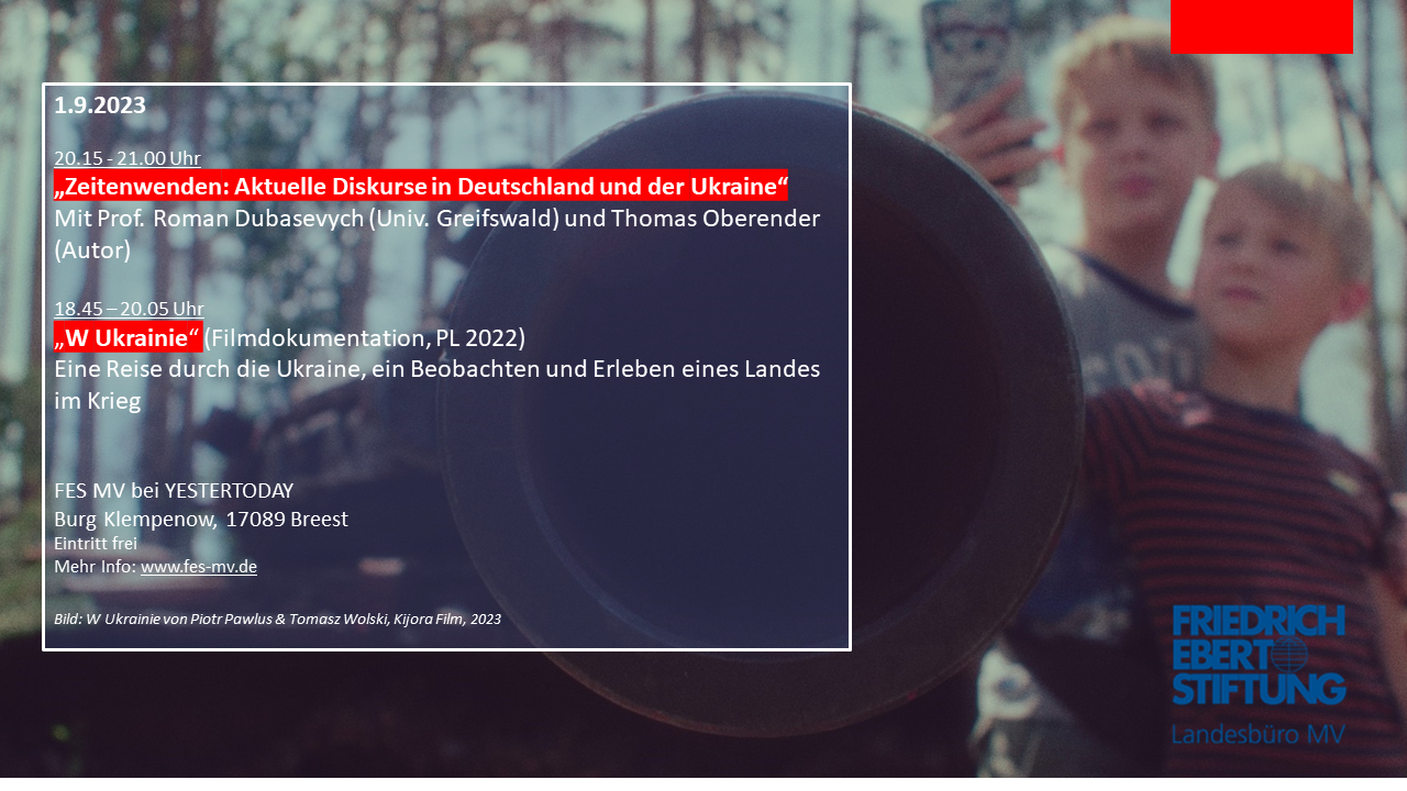 20.15 - 21.00 Uhr, Gespräch und Diskussion:"Zeitenwenden: Aktuelle Diskurse in Deutschland und der Ukraine"Die russische Aggression in der Ukraine seit 2022 ist kein regionales Ereignis, sondern von globaler Dimension. Fragen der Sicherheit, der Aufrüstung, der Blockbildung, der Abgrenzung, Sieg oder Niederlage, Menschenrechtsverletzungen, gefallene Soldaten...Vor wenigen Jahren beinahe unvorstellbar, wenn es um die Gestaltung der Zukunft in Europa ging. Der ukrainische Blick weist andere Bezugslinien auf. Er ist beispielsweise verwoben mit der sowjetischen Epoche einschließlich der 1930er Hungerjahre, mit der Wiedererlangung der Selbstständigkeit ab 1991 und weiß um den bereits militärisch geprägten Konflikt in der Ostukraine seit 2014. Wie haben sich in beiden Ländern Sichtweisen, Zukunftsfragen, Werte verändert? Sind Verschiebungen zwingend von Dauer oder allein dem konkreten Kriegskontext geschuldet? Wurden Treffpunkte und Begegnungsorte begraben, die es lohnt, wieder freizulegen? Gibt es Jahrzehnte währende Kontinuitäten, die standhalten? Mit: Roman Dubasevych (Lehrstuhl für Ukrainische Kulturwissenschaft, Univ. Greifswald), Thomas Oberender (Autor, Berlin), Tobias Paul (FES) 18.45 bis 20.05 Uhr, Filmdokumentation: "W Ukrainie" (PL, D 2022) Zerbombte Straßen, Sperrholzplatten statt Fenstern, zerstörte russische Panzer. Diese Bilder sind die wiedererkennbaren Zeichen des russisch-ukrainischen Krieges – Oberflächenspuren, die in den Massenmedien reproduziert werden. Ausgehend von diesen Bildern beginnen die beiden Regisseure Tomasz Wolski und Piotr Pawlus ihre Reise durch die Ukraine. Dieser Weg führt tief hinein in die Kriegserfahrung, vom Beobachten zum Erleben des Krieges. Plötzliche Explosionen in der Nähe einer Haltestelle, Abendessen im U-Bahn-Bunker, im Versteck mit ukrainischen Soldaten, Friedhöfe, auf denen ukrainische Fahnen wie ein dichter Hain über neuen Gräbern wehen. Bild für Bild ersetzen die Regisseure das Gleiten auf der Oberfläche reproduzierbarer Kriegsbilder durch das Eintauchen in die Wirklichkeit, in der das Land seit dem 24. Februar 2022 lebt.(Ukrainisch, Russisch mit deutschen Untertiteln.)Der Abend ist eine Kooperation der Bert Neumann Association und der FES MV im Rahmen des Programms YESTERTODAY. Mehr Info: bna.uber.space