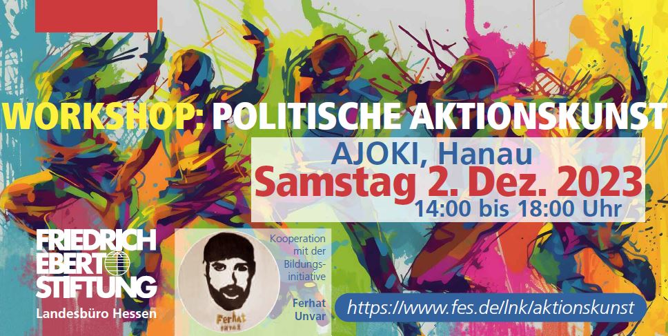 Ihr möchtet eurer gesellschaftlichen Herzensangelegenheit mehr Aufmerksamkeit verschaffen? Ihr interessiert euch für alternative Wege, um politisch aktiv zu werden? Politische Aktionskunst – das klingt irgendwie spannend?Dann ist dieser Workshop genau das Richtige für euch! Politische Aktionskunst kann neue Zielgruppen erreichen, Öffentlichkeit erzeugen und Ausdrucksform für euren Aktivismus sein.Diese Veranstaltung ist eine Kooperation der Friedrich-Ebert-Stiftung, Landesbüro Hessen mit der Bildungsinitiative Ferhat Unvar e.V.