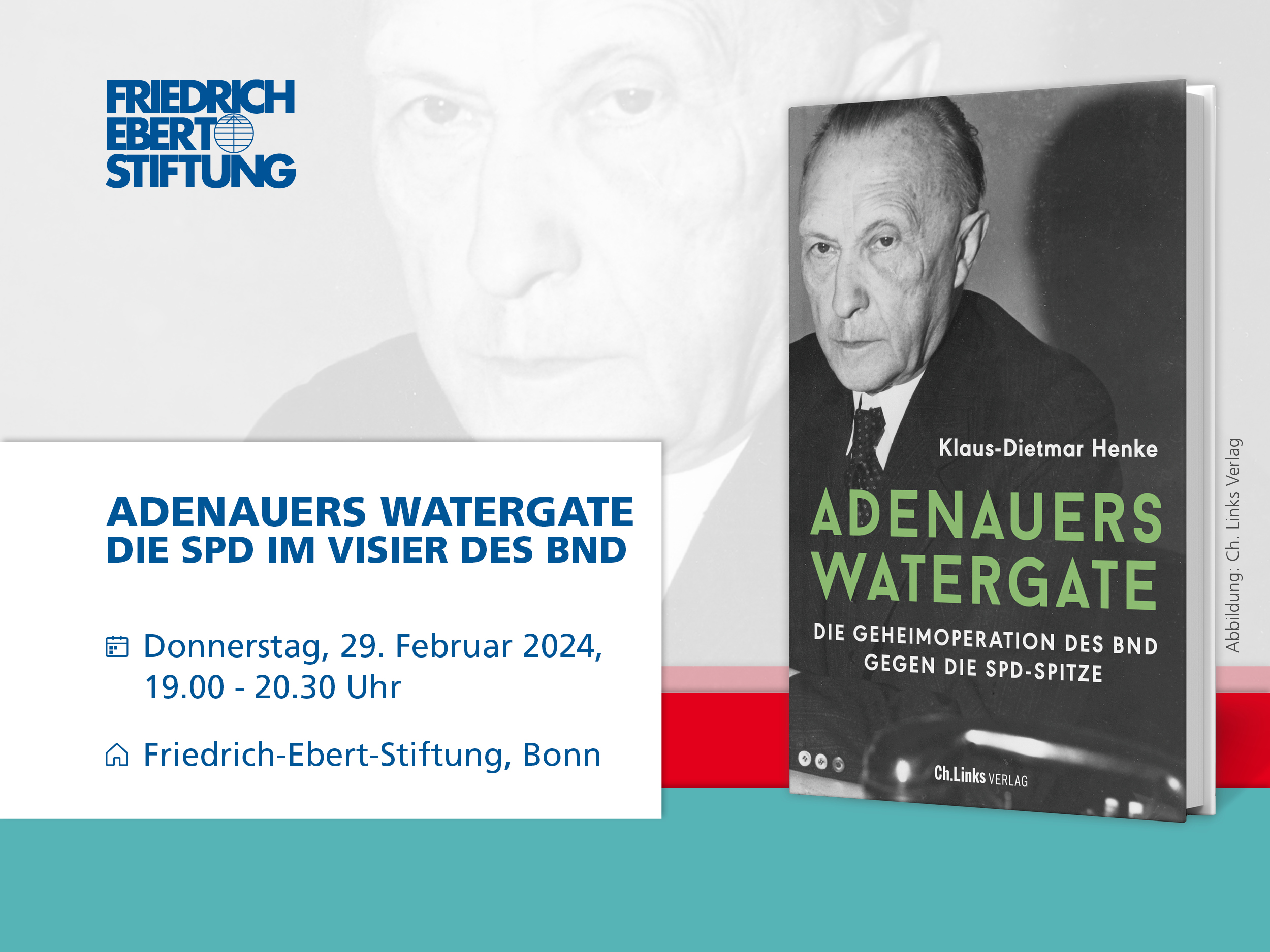Konrad Adenauer (CDU) ließ von 1953 bis 1962 die SPD bespitzeln. Gesetzeswidrig nutzte der Bundeskanzler dafür den Bundesnachrichtendienst (BND), der mit Hilfe von Informanten im SPD-Apparat direkte Informationen aus dem Parteivorstand an das Bundeskanzleramt übermittelte, etwa über Wahlkampfstrategien oder Personalfragen. Diese fast zehn Jahre andauernde illegale Geheimoperation gegen die Sozialdemokratie lässt die Anfangsjahre der zweiten deutschen Demokratie in einem anderen Licht erscheinen.Aufgedeckt wurde dieser Skandal durch Klaus-Dietmar Henke, Sprecher der Unabhängigen Historikerkommission zur Erforschung der Geschichte des BND. Mit ihm, Daniela Münkel (Stasi-Unterlagen-Archiv) und Friedrich Kießling (Universität Bonn) diskutieren wir, welche Bedeutung die Ausspähung für die Entwicklung von Rechtsstaat und Demokratie in der Bundesrepublik hatte und inwieweit die Ära Adenauer neu beurteilt werden muss. Zur Teilnahme an der Veranstaltung bitten wir um Anmeldung bis zum 27. Februar unter: public.history@fes.deWeitere Informationen: www.fes.de/geschichte/veranstaltungen/adenauers-watergate