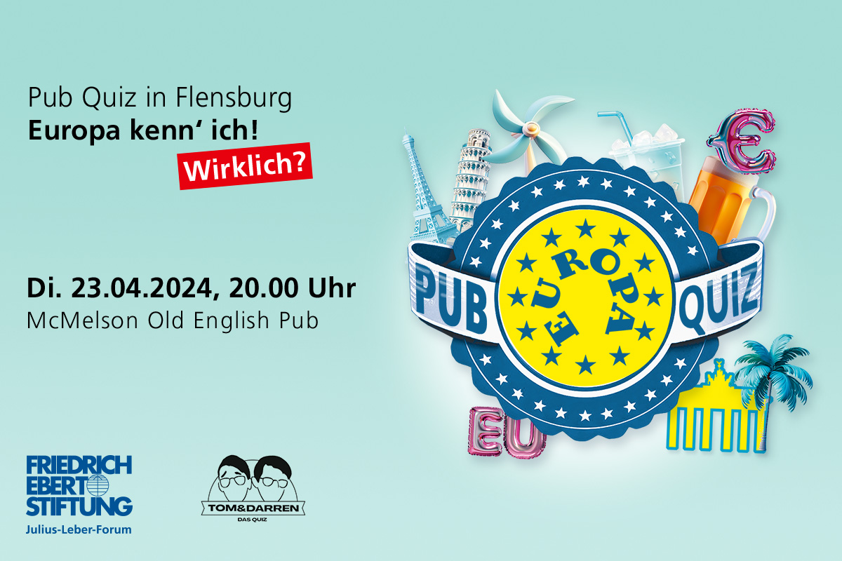 Unsere Quizmaster Tom und Darren nehmen euch mit auf eine Tour durch Europa. Im Gepäck haben sie jede Menge Fragen, Sound- und Bilderrätsel rund um die großen Themen der europäischen Gegenwart und die kleineren Banalitäten des Alltags zwischen Lissabon und Nikosia. Zum Mitspielen und Gewinnen müsst ihr weder Kenner*innen der lettischen Küche sein, noch ein Faible für rumänische Außenpolitik haben. Ein wenig Allgemeinwissen in Geschichte, Sport, Kultur etc., ein bischen Glück beim Einfach-Drauflosraten und die Schwarmintelligenz eures Teams genügen schon. Gespielt wird nämlich nicht alleine auf der Bühne, sondern in geselliger Runde in Gruppen von bis zu sechs Personen.Pub Quiz – Europa kenn‘ ich! Wirklich?Am 23.04.24 um 20:00 UhrMcMelson Old English PubNorderhofenden 10, 24937 FlensburgMit an Bord sind zudem Kianusch Stender (Mitglied des Schleswig-Holsteinischen Landtags) und Marc Timmer (Mitglied des Schleswig-Holsteinischen Landtags) mit denen wir zwischen den Runden über aktuelle Herausforderungen und die Zukunft Europas sprechen wollen.Das Julius-Leber-Forum lädt euch auf das erste alkoholfreie Getränk ein!Die Teilnahme ist kostenlos. Um Anmeldung wird gebeten, am besten einfach über den „Anmelden" Button auf dieser Seite.