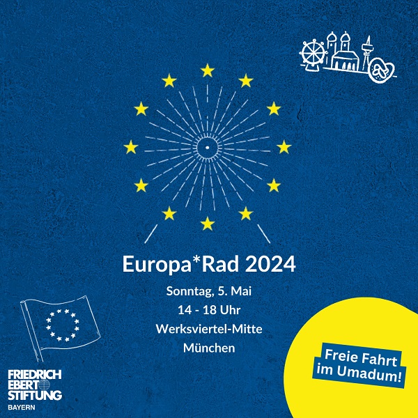 Am 9. Juni ist die Wahl zum Europäischen Parlament. Im Vorfeld der Europawahl erwartet Sie im Europa*Rad ein vielfältiges Programm für und mit Europa. In den 27 Gondeln des Riesenrads finden am 5. Mai von 14-18 Uhr Workshops, Aktionen und Begegnungen rund um Europa statt. Auch die Friedrich-Ebert-Stiftung empfängt Sie in einer der Gondeln: Sara Hoffmann-Cumani und Thomas Purucker (Autor_innen von „Demokratie lohnt sich!“) und Schüler_innen der Max-Mannheimer-Mittelschule Garching freuen sich auf den Austausch mit Ihnen darüber, welche europäische und demokratische Werte Ihnen wichtig sind. Ihre Meinung, Ihre Ideen und Visionen für Europa werden mit dem „Werteregal“ sichtbar gemacht. Die Fahrten im Europa*Rad 2024 sind kostenfrei. Einlass ohne Anmeldung.Das Europa*Rad wird veranstaltet von der Landeshauptstadt München, der Bayerischen Staatskanzlei, dem Verbindungsbüro des Europäischen Parlaments, der Vertretung der Europäischen Kommission in München, dem Centrum für angewandte Politikforschung der LMU und der Europa Union.Das Europa*Rad ist Teil des Münchener Europa-Mai.