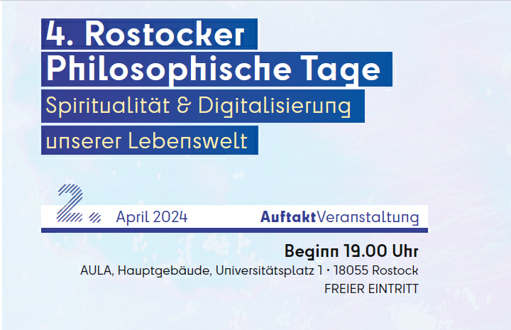 +++ Auftaktveranstaltung zu den 4. Rostocker Philosophischen Tagen +++Die menschliche Kreativität ist unbeschränkt und entscheidend für die Entwicklung von Technologie. Der Übergang vom Analogen ins Digitale im 20. Jahrhundert symbolisiert einen bedeutenden Fortschritt in der menschlichen Entwicklung, vergleichbar mit der Entstehung von Werkzeugen vor 100.000 Jahren. Die Digitalisierung hat sich seitdem so weit in unser Leben und Arbeiten integriert, dass eine Diskussion über das Digitale in all seinen Facetten geführt werden sollte. Zentrale Fragen drehen sich um die potenzielle Freiheit des Menschen durch Digitalisierung und Künstliche Intelligenz sowie die Notwendigkeit einer Regulierung dieser Entwicklungen.Diese Veranstaltung markiert den Beginn einer Diskussionsreihe, in der Informatik, Künstliche Intelligenz und ethische Aspekte zusammengeführt werden. Zu dieser und den folgenden Veranstaltungen sind Studierende, Forschende, IT-Expert_innen und die interessierte Öffentlichkeit herzlich eingeladen. Begrüßung: - Leon Griesch, Universität Rostock (Institut für Informatik / Regionales Zukunftszentrum)- Josephine Rößler (Bildungswerk der Wirtschaft MV)- Anne-Kim Sternberg (Universität Rostock, Institut für Philosophie)Im Anschluss Vorträge: 1) Philosophisches in der Informatik - Braucht die Informatik in Theorie und Praxis einen philosophisch-ethischen Denk- und Handlungsrahmen?--> Prof. Dr. Alke Martens, Universität Rostock2) Auswirkungen digitaler Arbeit auf Erleben und Verhalten von Mitarbeiterinnen und Mitarbeitern--> Dr. Henning Hummert, Institut für Betriebswirtschaftslehre, Universität Rostock 3) Digitalisierung unserer Lebenswelt--> Dr. Hans-Jürgen Stöhr, Rostocker Philosophische PraxisFreier Eintritt, eine Anmeldung ist nicht nötig. In Kooperation mit der Friedrich-Ebert-Stiftung Mecklenburg-Vorpommern.