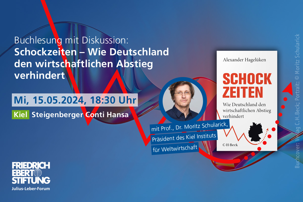 Inflation, kaputtgesparte Infrastruktur, Fachkräftemangel, Energiewende, schleppende Digitalisierung und die Liste ließe sich fortsetzen: Deutschland steht ökonomisch vor riesigen Herausforderungen und scheint im globalen Vergleich seine starke Position einzubüßen. Die Schuldenbremse verschärft die angespannte Lage weiter: Wichtige Zukunftsinvestitionen unterbleiben. Wie können wir diesem Abwärtstrend entgegensteuern? „Um seinen Wohlstand zu retten, muss Deutschland wirtschaftspolitische Tabus brechen“, findet Wirtschaftsjournalist Alexander Hagelüken und stellt in seinem Buch „SchockZeiten“ heraus, welche das sind. Was braucht es, um den Wirtschaftsstandort Deutschland zukunftssicher zu machen und Wohlstand gerechter zu verteilen?Darüber diskutieren wir mit: Alexander Hagelüken, Leitender Wirtschaftsredakteur Süddeutsche Zeitung,Autor des Buches „Schockzeiten“, Preisträger des Hans-Matthöfer-Preis 2024 Professor Dr. Moritz Schularick, Präsident des Kiel Instituts für Weltwirtschaft Serpil Midyatli, MdL SPD-Fraktionsvorsitzende Schleswig-Holstein,stv. Bundesvorsitzende und Landesvorsitzende der SPDHendrik Murmann, Vorstandsvorsitzender Unternehmensverband Kiel e.V.,Geschäftsführer J.P. Sauer & Sohn Maschinenbau GmbHModeration: Kristina Läsker, freie Journalistin Organisatorische Hinweise:Die Teilnahme ist kostenlos. Eine Anmeldung ist erforderlich über den "Anmelden" Button auf dieser Seite. Bei erfolgreicher Anmeldung senden wir Ihnen per Mail eine Bestätigung.Bei Rückfragen zur Barrierefreiheit wenden Sie sich gerne an uns unter 040-32587420 oder per E-Mail an hamburg@fes.de.