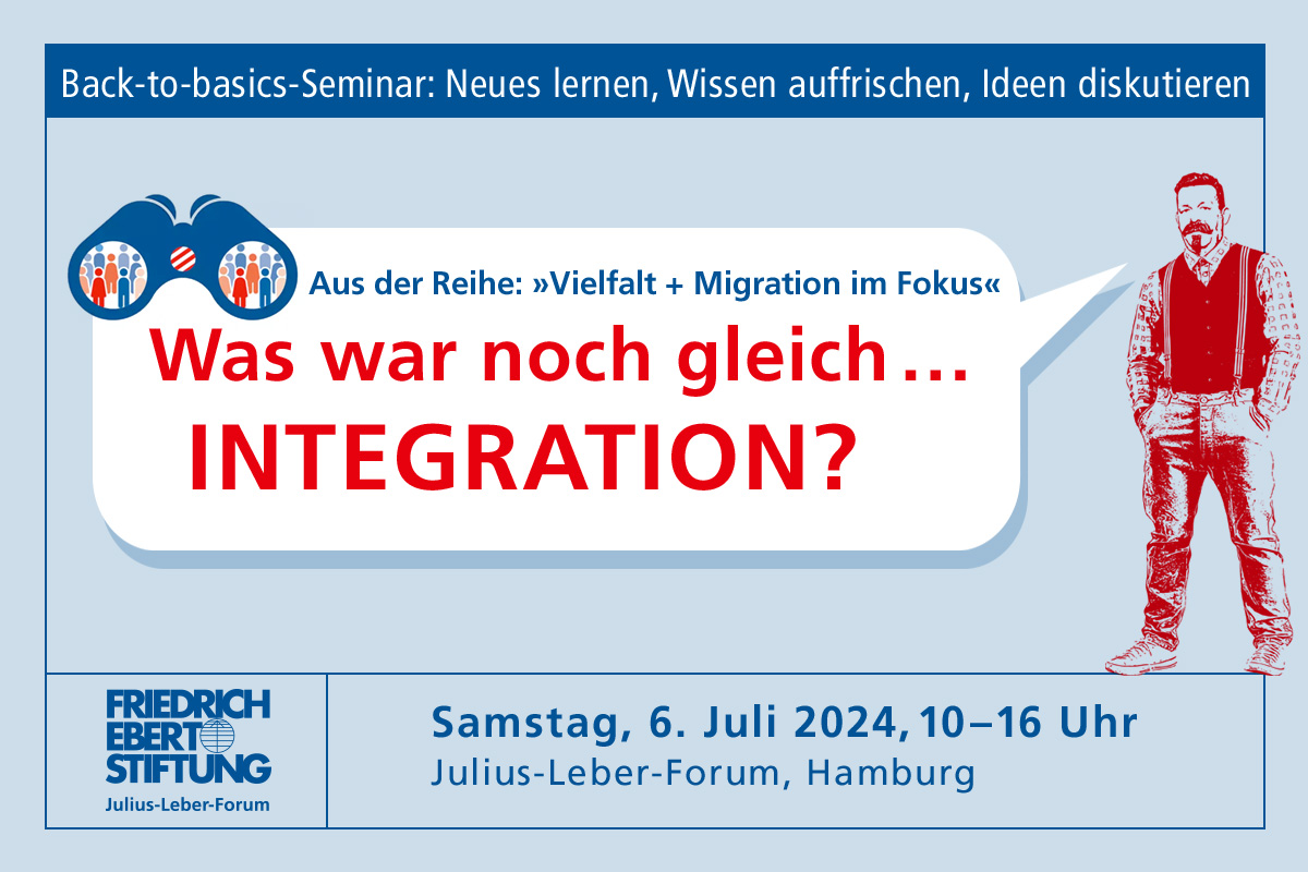 Was war noch gleich…Integration? Was ist Integrationspolitik und vor allem: sozialdemokratische Integrationspolitik? Diese Debatten werden nicht immer sachlich geführt. Dieses kompakte Seminar richtet sich an alle, die sich für die zentrale Rolle der Integration in der Gesellschaft interessieren und sich aktiv in die Diskussion einbringen möchten. Wir werden Erfahrungen und Ideen austauschen und verschiedene Konzepte der Integration anschauen und diskutieren.Gemeinsam werden grundlegende Begriffe der Integrationsdebatte erörtert und Definitionen gefunden. Woher stammen die Konzepte und Begriffe von Integration, Multikulturalismus, Assimilation und Leitkultur und was bedeuten sie für uns? Welche Rolle spielen die sozialdemokratischen Leitprinzipien Anerkennung und Teilhabe? Das Seminar richtet sich an alle, die ihr Wissen auffrischen möchten, oder neu lernen wollen, was es mit Integration und der Sozialen Demokratie auf sich hat. Es bietet in Gruppenarbeiten und kreativen Präsentationen viel Raum für Austausch – unter anderem aber auch beim gemeinsamen Mittagsimbiss. Zum Abschluss interviewen die Teilnehmenden unseren politischen Gast Kazim Abaci, Fachsprecher für Migration, Integration und Geflüchtete der SPD-Fraktion in der Hamburgischen Bürgerschaft und stellen persönlich ihre Fragen zu aktuellen integrationspolitischen Herausforderungen und Lösungsansätzen.Der Seminarleiter:Hermann Bock studierte Volkswirtschaftslehre und Personal- und Organisationsentwicklung in Kiel. Seit 2012 arbeitet Hermann im politischen Bildungs- und Projektmanagement.Die Veranstaltung ist Teil der Themenreihe der FES: „Vielfalt und Migration im Fokus“. In verschiedenen Formaten werden die Themen Migration, gesellschaftliche Vielfalt und Zusammenhalt sowie die Voraussetzungen dafür und die Bedrohungen davon beleuchtet. Dabei nähern wir uns dem Thema methodisch vielfältig. Ob Film- oder Theatergespräch, Seminar, Stadtführung oder Bootstour – wir freuen uns, wenn Sie dabei sind. Auf ein vielfältiges Jahr 2024!Am Samstag, 6.7.2024 von 10 bis 16 UhrIm Julius-Leber-Forum der Friedrich-Ebert-StiftungSchauenburgerstraße 49, 20095 HamburgDen Mittagsimbiss übernimmt die Friedrich-Ebert-Stiftung.Inhalt - Kurz und Kompakt:• Grundlagen von Integrationsdebatten• Soziale Demokratie, Anerkennung und Teilhabe• Politische IntegrationskonzepteProgramm:10:00 Vorstellungsrunde, Zentrale Begriffe der Integrationsdebatte, Soziale Demokratie und Kultureller Pluralismus Part I12:15 Mittagspause13:00 Soziale Demokratie und Kultureller Pluralismus Part II, Ebenen der Kultur und Dimensionen der Integrationspolitik14:30 Pause14:45 Interview mit politischem Gast: Kazim Abaci, Fachsprecher für Migration, Integration und Geflüchtete der SPD-Fraktion in der Hamburgischen Bürgerschaft15:45 Seminarevaluation16:00 EndeAnmeldung:Die Teilnahme ist kostenfrei und durch die Landeszentrale für politische Bildung der Freien und Hansestadt Hamburg gefördert. Eine Anmeldung ist erforderlich über den "Anmelden" Button auf dieser Seite. Die Zahl der Plätze ist begrenzt. Bei erfolgreicher Anmeldung senden wir eine Bestätigung.