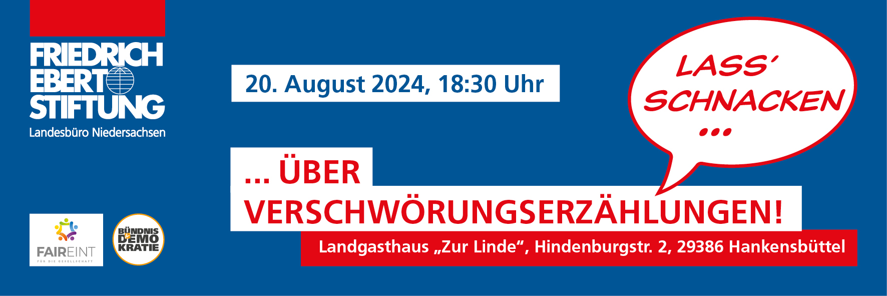 Was haben Bill Gates, das World Trade Center und Barcodes gemeinsam? Genau, sie sind Teil von Verschwörungserzählungen. Verschwörungsmythen gab es schon immer, allerdings machen das Internet und besonders die sozialen Medien die Verbreitung heute einfacher. Sie werden dann auch vom rechtsextremen Spektrum zur Verunsicherung der Bevölkerung genutzt. Aber was sind diese sogenannten Verschwörungstheorien überhaupt? Wie erkenne ich sie? Darüber wollen wir gemeinsam mit Euch und dem „Bündnis für Demokratie“ sprechen. Anmelden müsst Ihr euch nicht. Kommt gerne vorbei!