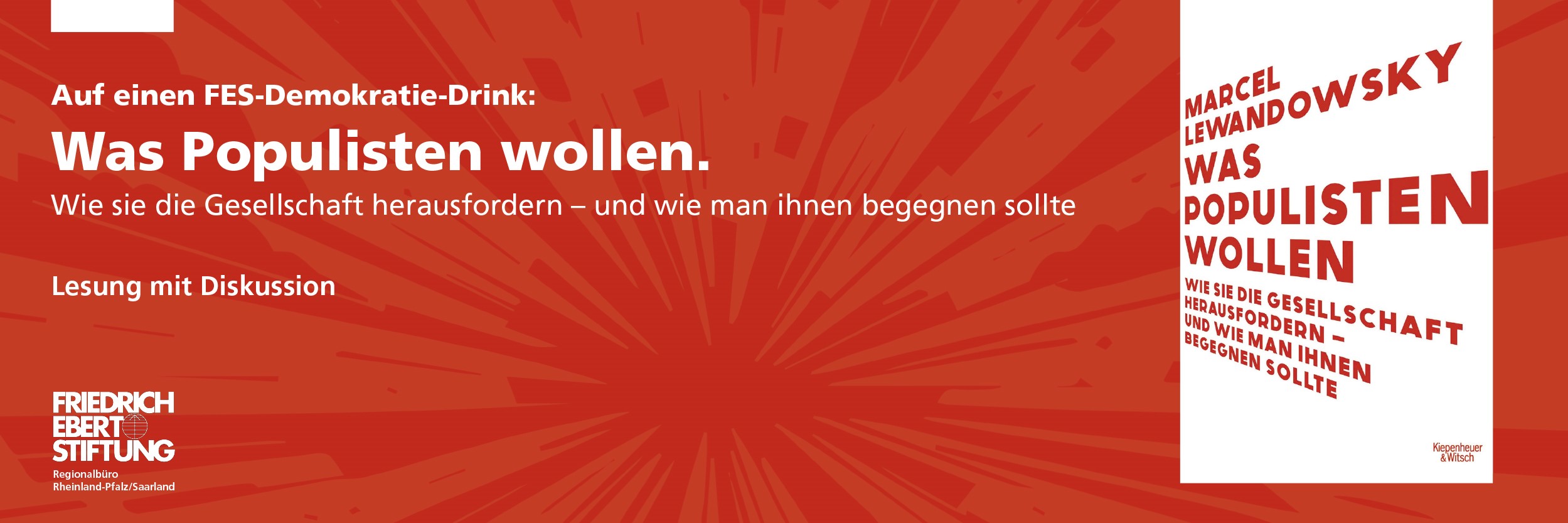 Auf einen FES-Demokratie-Drink:Was Populisten wollen. Wie sie die Gesellschaft herausfordern – und wie man ihnen begegnen sollteLesung mit Diskussion Die Umbrüche und Krisen der letzten Jahre – Corona, Klimakrise oder Kriege – haben ihre Spuren hinterlassen. Unsere Demokratie steht unter Druck. Unsicherheiten erhöhen sich und bieten das Einfallstor für antidemokratische und rechtsextreme Ideologien, wie auch zur Abwertung der „Anderen“. Seit Jahren nimmt die Zahl der Menschen zu, die rechtspopulistisch oder rechtsextrem wählen.Der Politikwissenschaftler Dr. Marcel Lewandowsky erklärt es mit der Ideologie und den Methoden des Rechtspopulismus. In seinem Buch „Was Populisten wollen. Wie sie die Gesellschaft herausfordern – und wie man ihnen begegnen sollte“ skizziert er diese Methoden sowie Gegenstrategien für Demokrat_innen, die auf mehreren Ebenen funktionieren. Wie stärken wir unsere Demokratie? Das wollen wir mit Ihnen, Dr. Marcel Lewandowsky, Matthias Mieves, MdB und weiteren Gästen diskutieren.