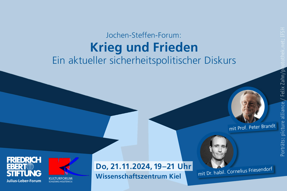Kriege und Konflikte erschüttern die Welt. Politik und Militär fordern Verteidigungs- und/oder Kriegsbereitschaft – je nach Lesart. Es wird massiv in Rüstung investiert. Die «regelbasierte Ordnung» Europas ist spätestens seit dem russischen Angriffskrieg auf die Ukraine selbst in die Schusslinie geraten. Immer wieder gibt es Debatten über die (Un-)Möglichkeiten von Diplomatie und Politik. Diese werden oft verstanden als Gegensatz zu militärischen Interventionen und Machtdemonstrationen. Es scheinen sich unversöhnliche Positionen gegenüberzustehen. Doch: Wie steht es um die Aussicht auf Frieden? Was ist, was scheint möglich zu sein? Auf welchen Vorstellungen, Erfahrungen und Strukturen können politische Lösungen aufsetzen, um die aktuellen Kriege und Konflikte in Europa und darüber hinaus beizulegen? Wir laden zu einem offenen, respektvollen Streitgespräch zu diesen Fragen zwischen: • Prof. Peter Brandt, em. Historiker, u.a. engagiert in der Initiative „Entspannungspolitik – Jetzt!“ und• Dr. habil. Cornelius Friesendorf, Leiter des Zentrums für OSZE-Forschung am Institut für Friedensforschung und Sicherheitspolitik an der Universität HamburgModeration: Hannah Böhme, Journalistin NDR Mit einem Kuddl Schnööf-Beitrag.Diskutieren wir nach dem Motto:„Zu sagen was ist, ist hier - wie immer - das Radikale, weil es den Übersteigerungen die Grundlage nimmt und auf das Konkrete, das wirklich Machbare zurückführt.“- Jochen Steffen, Krisenmanagement oder Politik, 1974Eine Kooperation des Kulturforums Schleswig-Holstein e.V. und des Julius-Leber-Forums der Friedrich-Ebert-Stiftung e.V. Die Teilnahme ist kostenlos.Eine Anmeldung ist erforderlich über den "Anmelden" Button auf dieser Seite.Bei erfolgreicher Anmeldung senden wir Ihnen per Mail eine Bestätigung.Bei Rückfragen zur Barrierefreiheit wenden Sie sich gerne an uns unter 040-32587420 oder per E-Mail an hamburg@fes.de.