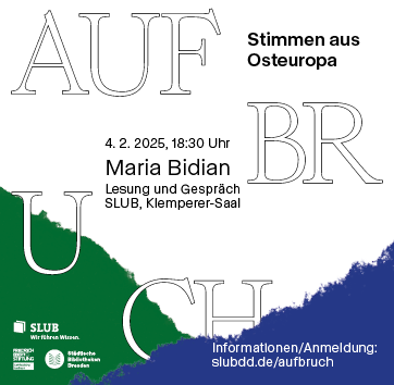 Die Systemumbrüche und damit verbundenen politischen und wirtschaftlichen Prozesse im östlichen Europa seit den 1990er Jahren beeinflussen das Leben bis heute. Wie blicken Autorinnen und Autoren mit osteuropäischen Wurzeln 35 Jahre nach dem Zusammenbruch des sogenannten Ostblocks auf ihre Herkunftsländer? Was ist aus den Träumen des Aufbruchs geworden? Inwiefern haben sich wirtschaftliche Veränderungen auf Familien ausgewirkt? Wie gehen verschiedene Generationen mit dem neuen System um? Ist ein Sich-Hin-und-wieder-Abwenden von Demokratie Teil der Suche nach Identität? Was wissen wir über das Leben und die Schicksale in diesen Ländern im Strudel der globalen Nachrichten?An vier Abenden geht die Literaturreihe AufBruch diesen Fragen nach und lässt Schriftsteller:innen, die aus Osteuropa stammen, in Lesung und Gespräch zu Wort kommen. Zu Gast sind Saša Stanišić, im ehemaligen Jugoslawien geboren und seit vielen Jahren in Deutschland lebend, Joanna Bator aus Polen, Zsófia Bán aus Ungarn und Maria Bidian, die ihr Leben zwischen Deutschland und Rumänien teilt.Letzte Veranstaltung der Reihe am 4.2. im Klemperer-Saal der SLUB