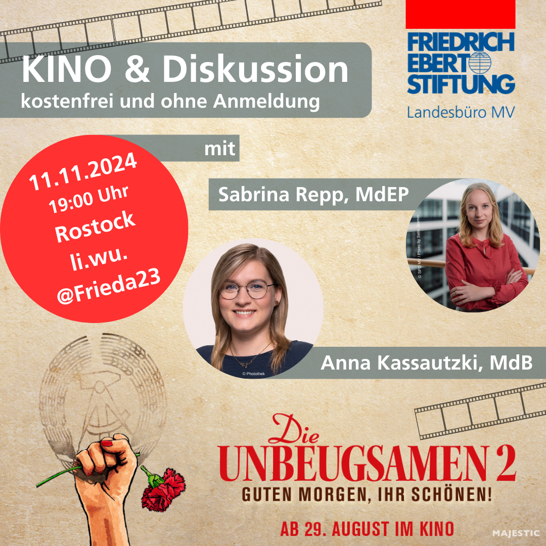 Mit seinem Dokumentarfilm-Hit DIE UNBEUGSAMEN setzte Regisseur Torsten Körner den Politikerinnen der Bonner Republik und ihrem Kampf um politische Teilhabe ein filmisches Denkmal – fast 200.000 Zuschauer.innen strömten in die Kinos. Nun richtet er mit der Fortsetzung DIE UNBEUGSAMEN 2 – GUTEN MORGEN, IHR SCHÖNEN! seinen Blick auf die andere Seite des Eisernen Vorhangs und zeichnet ein lebendiges Gruppenporträt ostdeutscher Frauen aus den verschiedensten Gesellschaftsbereichen der DDR. Fünfzehn selbstbewusste Frauen erzählen, wie auch im Land der staatlich verordneten Gleichberechtigung trotzdem das Patriarchat regierte und schaffen damit ein kraftvolles Kaleidoskop der Geschlechterbeziehungen im Arbeiter- und Bauernstaat. Der Film bietet den beeindruckenden Lebensleistungen der ostdeutschen Frauen und ihrem Kampf um Chancengleichheit eine fesselnde Bühne.Montag, 11.11.24, um 19.00 Uhr im Lichtspieltheater Wundervoll in der FRIEDA 23 (Rostock)****** komplett kostenfrei und ohne Anmeldung ********Wir zeigen den Film und wollen im Anschluss darüber diskutieren, Fragen stellen, Perspektiven austauschen, zusammen mit:- Sabrina Repp, Mitglied des Europäischen Parlamentsund- Anna Kassautzki, Mitglied des Deutschen BundestagsModeration: Ines Koenen (Trainerin, Dozentin, Coach)Weitere Info zum Kino:www.liwu.de/kinoprogramm/a-z/4756-die-unbeugsamen-2-guten-morgen-ihr-schoenen