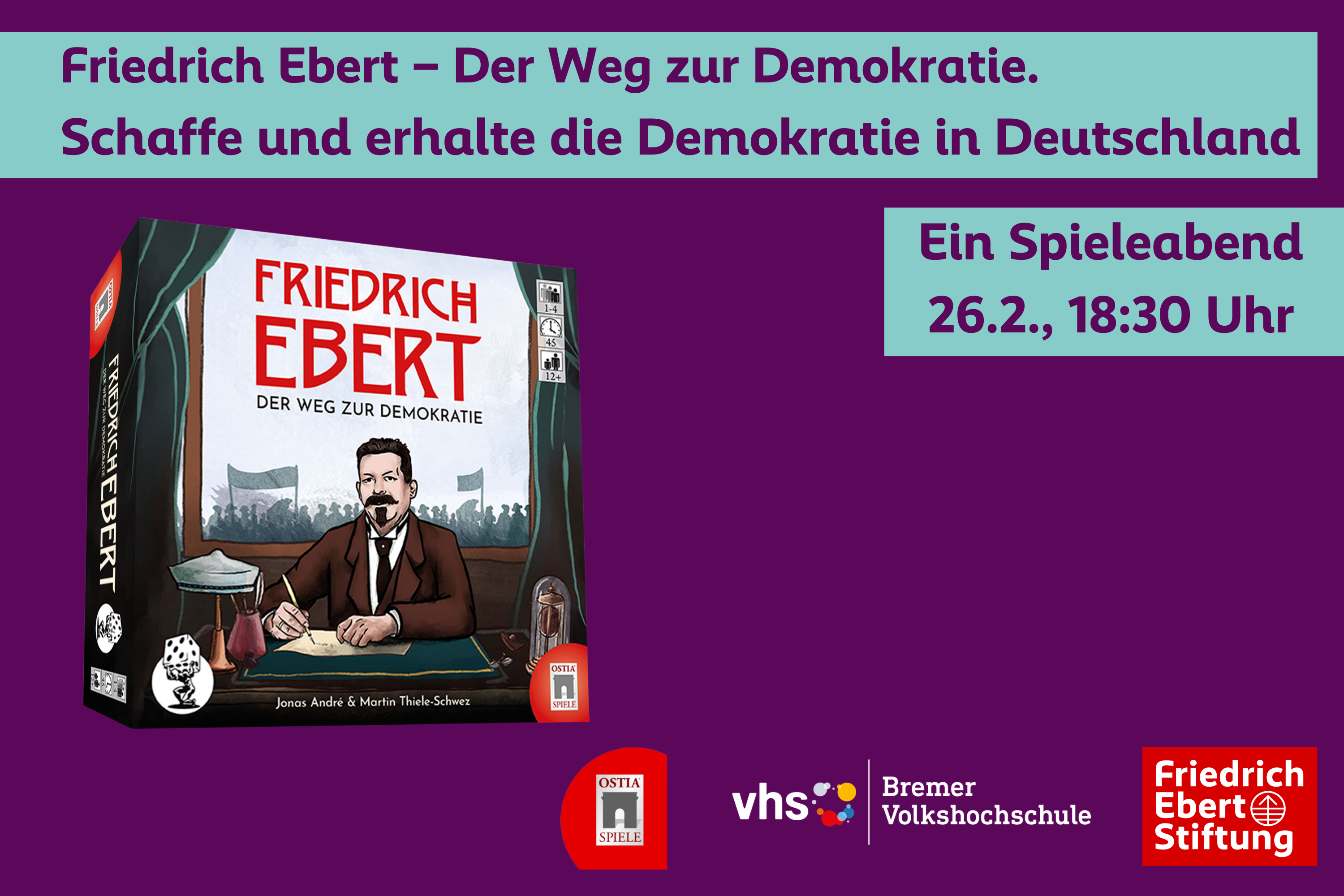 ++++Für diese Veranstaltung ist keine Anmeldung erforderlich+++Friedrich Ebert – Der Weg zur Demokratie. Schaffe und erhalte die Demokratie in DeutschlandSie sind herzlich eingeladen zu einem Spieleabend, der uns in die Zeit von Friedrich Ebert mitnimmt. Gespielt wir ein kooperatives Serious Game. Das heißt, die Spieler*innen spielen im Team und nicht gegeneinander. Die Aufgabe des Teams ist es, durch strategisches Handeln die politischen Ziele Eberts umzusetzen und eine demokratische Grundordnung aufzubauen. An diesem Abend besteht die Möglichkeit, angeleitet in das Spiel einzusteigen und mit einem der Herausgeber und der Leiterin des Regionalbüros der Friedrich-Ebert-Stiftung ins Gespräch zu kommen. Dabei wird es auch darum gehen, ob und wie es gelungen ist, reale historische politische Ereignisse in ein Spielgeschehen zu übertragen und kurz vor seinem 100. Todestag mehr über Friedrich Ebert zu erfahren, dem ersten demokratischen Staatsoberhaupt in der deutschen Geschichte. Bringen Sie Ihre Freund*innen mit oder finden Sie ein Team vor Ort - spielen Sie mit! In Kooperation mit der Bremer Volkshochschule und dem Ostia-Verlag.Mittwoch, 26. Februar 2025, 18:30 Uhr vhs im Bamberger Haus, Faulenstraße 69, Raum 312, 28195 Bremen.Der Eintritt ist frei.