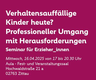 Der zweiteilige Fortbildungsvortrag integriert kleine themenzentrierte Interaktionen, ermuntert zur fallbezogenen Praxisreflexion in Kleinstgruppen und thematisiert schließlich Methoden für den pädagogischen Alltag sowie das professionelle Selbstverständnis von pädagogischen Fachkräften in KiTa und Hort heute. Folgende Vortragsinhalte werden bearbeitet:- Einstieg mit Zeitdiagnose: KiTa- und Hortkinder im heutigen Betreuungsalltag- Belastungen, Bedarfe und Ressourcen von Kindern (und Eltern) heute: Entwicklungsaufträge- Verhaltensdispositionen vs. Erkrankungen: Formen/ Einordnung zum (Ver-)Störungsverhalten- Methodische Ansätze in der Kommunikation und Interaktion mit "auffälligen" Kindern- Schlüsselprinzipien in der Raum- und Strukturgestaltung für den KiTa- und Hortalltag- Handlungsansätze für die Elternarbeit sowie Ansätze der Verweispraxis- "Der gemeinsame Strang": Professionalität und "Fach-WIR" in unserem Teamzusammenspiel- Ergebnissicherung und AusblickPROGRAMM17.00 Uhr Begrüßung durch Susann Rüthrich, Kinder- und Jugendbeauftragte der Sächsischen Staatsregierung17.15 Uhr Seminarbeginn mit Dipl.- Soz.-päd. Prof. Dr. phil. Michel Constantin Hille18.30 Uhr Pause mit kleinem Imbiss19.00 Uhr … weiter im Thema …Möglichkeiten für Beiträge aus dem PublikumAbschluss 20.30 UhrModeration: Jacqueline Hertrampf-BierANMELDUNG bitte bis zum 09.04.2025 an :Frau Hertrampf-BierZittauer Kindertagesstätten gGmbHLortzingstraße 102763 ZittauFAX: 03583 753 111E-mail: hertrampf-bier(at)gernegross.infoWEITERE INFOSIhre Anmeldung gilt als verbindlich, wenn Sie von uns keine Absage erhalten. Sie erhalten nach der Veranstaltung eine Teilnahmebestätigung und eine Quittung über die geleistete Teilnahmepauschale.Wir erheben eine Teilnahmepauschale in Höhe von 10,00 Euro. Darin enthalten sind ein kleiner Imbiss und Getränke.