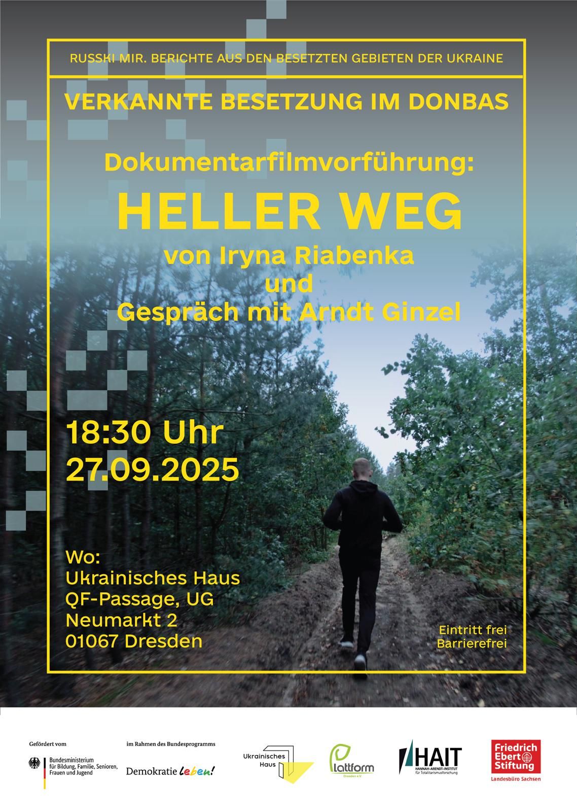 Die Vollinvasion der russischen Armee in die Ukraine im Jahr 2022 war nicht der Beginn des Krieges, sondern seine Ausweitung. Bereits seit 2014 steht russisches Militär im Donbas. In den so genannten "Volksrepubliken" errichteten sie mit Separatisten ein System der Repression und Folter. Der bewegende Dokumentarfilm "Heller Weg" basiert auf dem authentischen Bericht des fast 1000 Tage inhaftierten ukrainischen Journalisten Stanislav Aseyev und bezeugt die Besatzung im Donbas und das Foltersystem seit 2014.Nach der Vorführung des Dokumentarfilms (56 Min) ordnen die ukrainische Regisseurin Iryna Riabenka und Journalist Arndt Ginzel das Thema Folter im Donbas damals und heute ein und stellen die Ereignisse in den größeren Kontext. Die Filmemacherin Iryna Riabenka stammt aus Charkiw und lebt seit knapp 10 Jahren in Deutschland. Für ihr Regiedebüt "Heller Weg" erhielt sie mehrere Preise auf Festivals weltweit.Der Journalist Arndt Ginzel recherchiert seit Jahren vor Ort in der Ukraine und wurde 2015 zwischenzeitlich von prorussischen Separatisten verhaftet. Die Vollinvasion erlebte er zufällig im Rahmen länger geplanter Recherchen in der Ukraine selbst und reiste seitdem wiederholt auch in die unmittelbaren Frontgebiete.Der Eintritt ist frei. Der Veranstaltungsort ist barrierefrei.Mit Ihrer Anfrage sind Sie automatisch angemeldet. Eine erneute Benachrichtigung erfolgt nicht!.Während den Veranstaltungen der Friedrich-Ebert-Stiftung e.V. werden Fotos und ggf. Film- und/oder Audioaufnahmen gemacht. Durch Ihren Besuch erklären Sie sich damit einverstanden. Weitere Infos zum Datenschutz finden Sie auf der FES-Website.Wir bitten um Ihre Anmeldung bis zum 26.9.2025.Eine Kooperation mit Plattform Dresden/Ukrainisches Haus Dresden e.V., dem Hannah-Arendt-Institut für Totalitarismusforschung e. V. (HAIT) und der Friedrich-Ebert-Stiftung Sachsen.