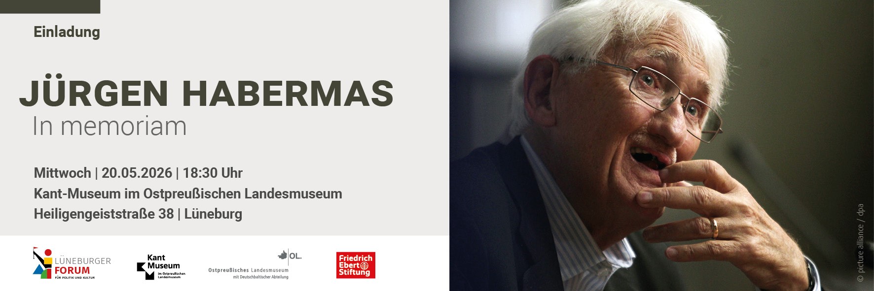 Detlef Horster zeigt die innere Entwicklung und Architektur des Habermasschen Werkes auf, der die bundesrepublikanische Demokratie und Wissenschaft durch seine Eingriffe seit 1953 entscheidend mitgestaltete und geprägt hat. Er hat der Politik Impulse gegeben, die die Politiker dankbar aufgenommen und auch umgesetzt haben. Jürgen Habermas wird auch weiterhin aktuell bleiben. Detlef Horster übermittelt bei seinem Vortrag gleichzeitig die Lebensdaten von Jürgen Habermas.Detlef Horster war bis 2007 Professor für Sozialphilosophie an der Leibniz Universität Hannover. Er war Gastprofessor in Utrecht, Wien, Port Elizabeth und Zürich und hat über Jürgen Habermas publiziert. Detlef Horster war mit Jürgen Habermas befreundet.Kant-Museum im Ostpreußischen LandesmuseumHeiligengeiststraße 38 | 21335 LüneburgEintritt: 5,– EuroAnmeldung erforderlich unterTel. 0 41 31–759 950 oder info@ol-lg.de