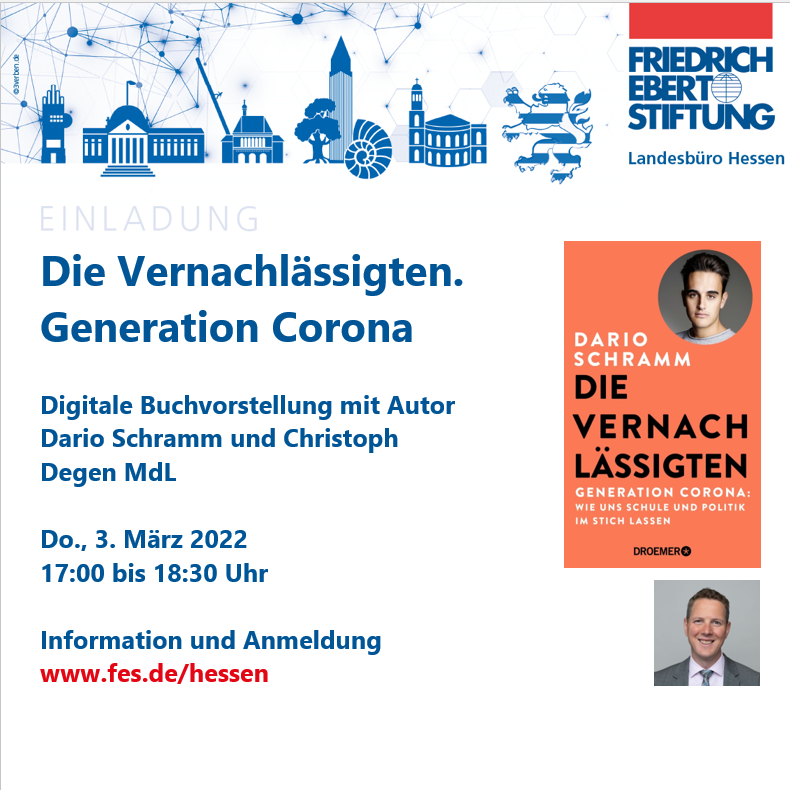 Wie kann es sein, dass Kinder und Jugendliche nicht nach ihren Bedürfnissen gefragt werden? Warum werden sie, wenn überhaupt, nur als Allerletzte mitgedacht? Und wieso wird die Lufthansa mit einem Milliarden-Paket gerettet, während es in Schulen immer noch an Luftfiltern und schnellem Internet hapert? Diese Fragen stellt Dario Schramm, bis Herbst 2021 Generalsekretär der Bundesschülerkonferenz, in seinem frisch erschienenen Buch „Die Vernachlässigten“.Als Abiturient während der Corona-Pandemie kann der Autor aus eigenen Erfahrungen und aus denen seiner Generation berichten – einer Generation, die ihre Interessen als vernachlässigt wahrnimmt; gar einer „verlorenen Generation“? Schramm zeigt die eklatanten Probleme von schleppender Digitalisierung über Chancenungleichheit bis hin zu fehlender Mitsprache auf und macht konstruktive Lösungsvorschläge. Über diese möchten wir mit Dario Schramm, mit dem hessischen Bildungspolitiker Christoph Degen und mit Ihnen als Teilnehmenden ins Gespräch kommen.Alle weiteren inhaltlichen und organiatorischen Informationen entnehmen Sie bitte der Einladung. Anmeldung bitte an Landesbuero.Hessen@fes.de